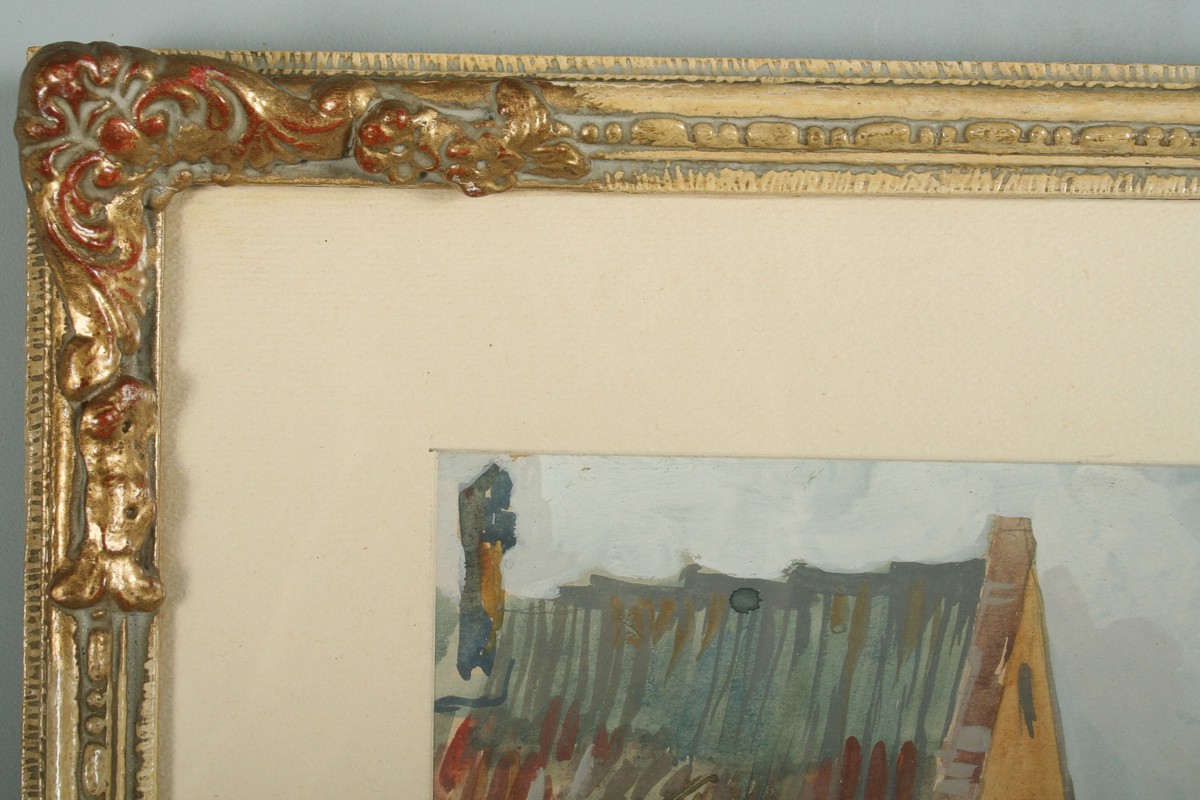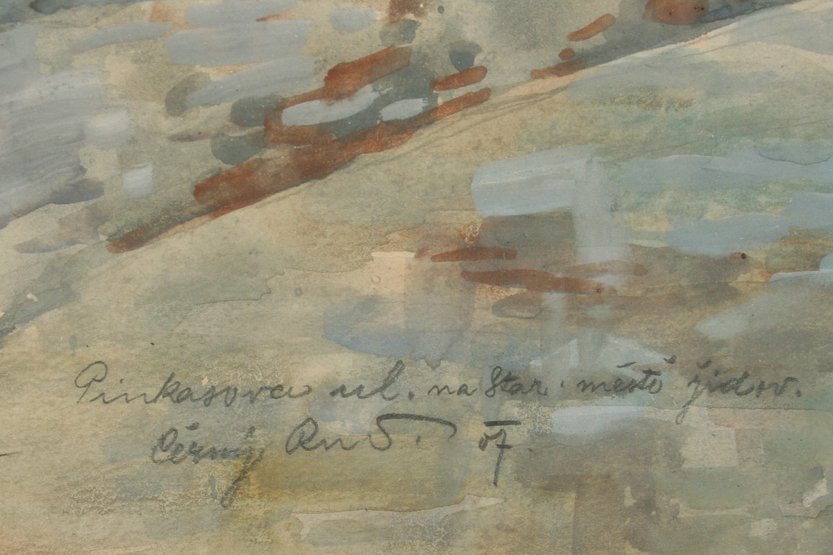 obraz Pinkasovy ulice na Starém městě židovském v Praze akvarel na papíře ve výřezu 26 x 38 cm, s rámem 56 x 43 cm, autor Rudolf Černý podepsáno vpravo dole Černý Rud. 07 s přípisem určení, rámováno v paspartě a ozdobném rámu pod sklem