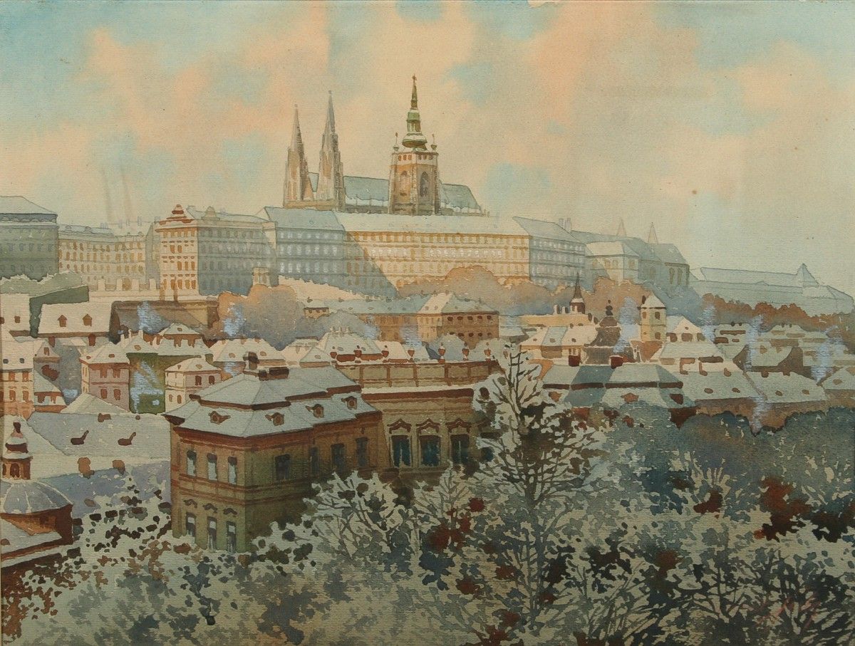 obraz zimní Prahy akvarel na papíře ve výřezu 32 x 43 cm, s rámem 55 x 65 cm, autor Karel Šulc, podepsáno vpravo dole Karel Šulc, rámováno v původní paspartě a rámu pod sklem