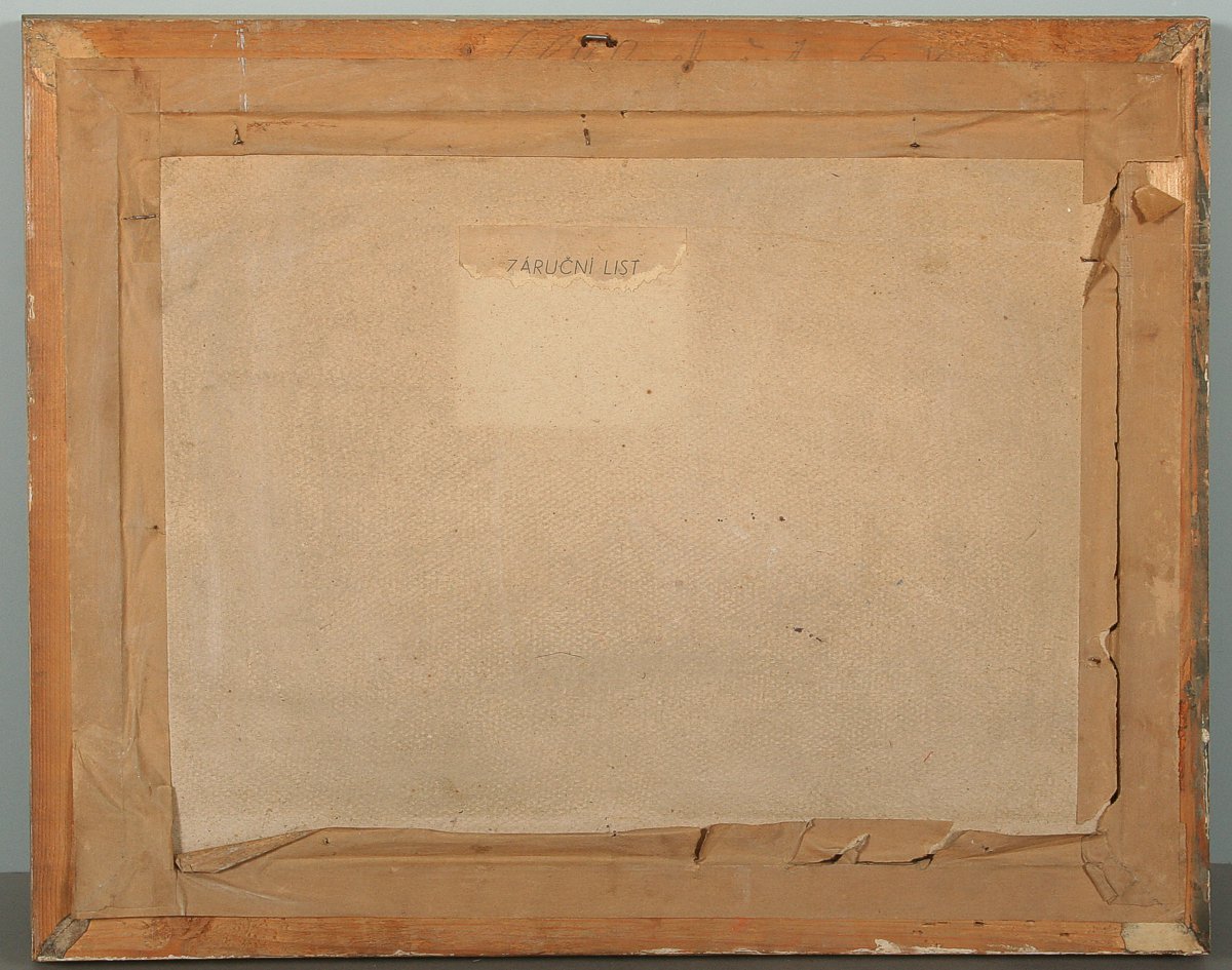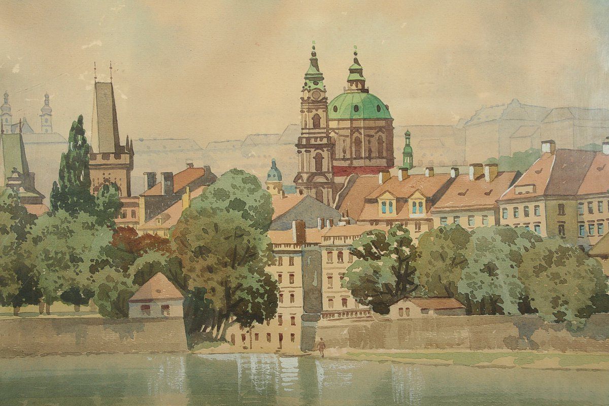 obraz Prahy u Karlova mostu vyústění Čertovky do Vltavy, akvarel na papíře 29 x 39 cm, s rámem 39 x 49 cm, autor Karel Šulc, podepsáno vpravo dole Karel Šulc, rámováno v původním rámu pod sklem