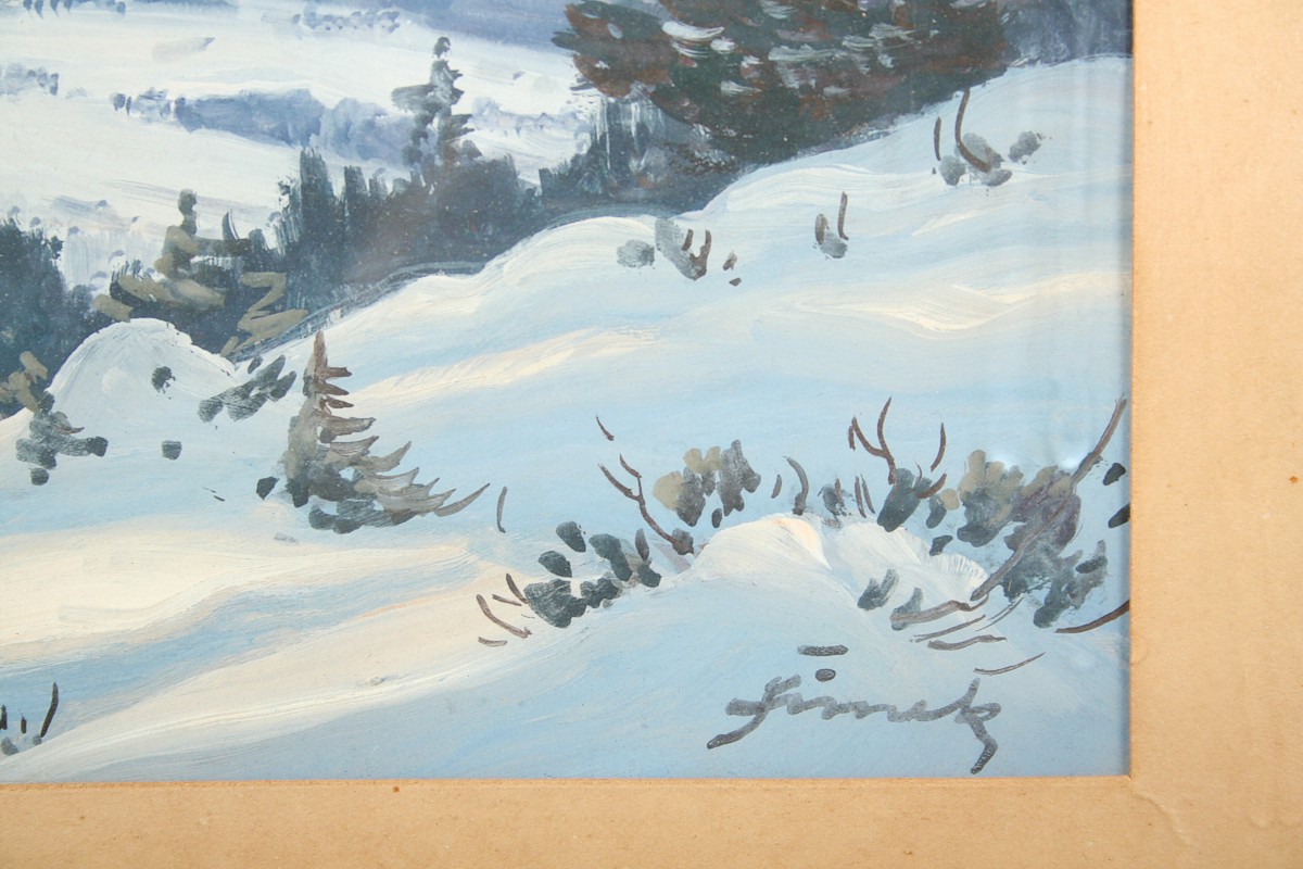 obraz zimní krajiny v horách, olej tempera na kartonu, ve výřezu 21 x 29 cm s rámem 41 x 50 cm, autor Jindřich Šimek, podepsáno vpravo dole J. Šimek, rámováno v původním rámu a paspartě pod sklem