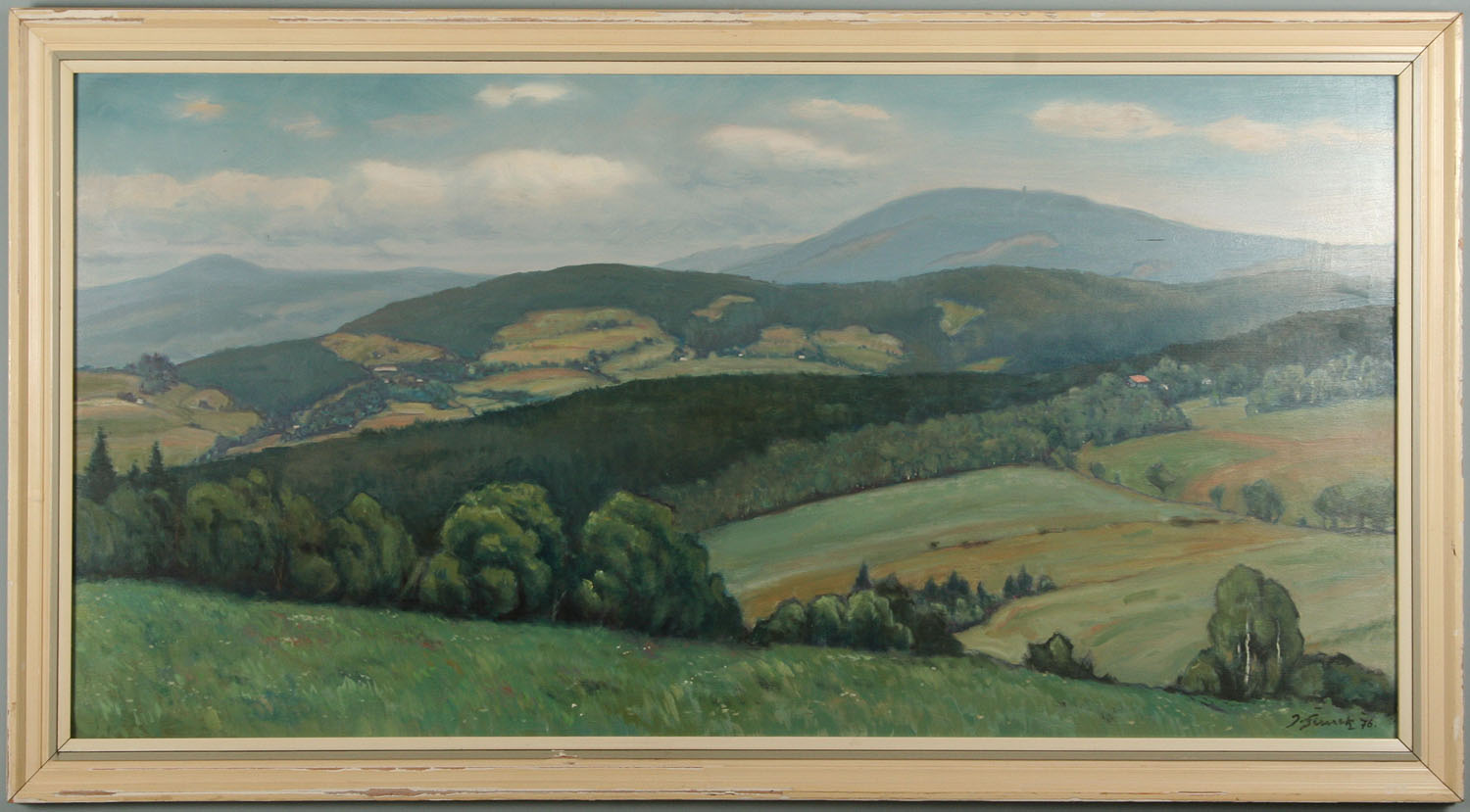 obraz hornaté krajiny, olej na desce 55 x 112 cm s rámem 66 x 122 cm, autor Jindřich Šimek, podepsáno vpravo dole J. Šimek 75 a ze zadu na desce autorský štítek, rámováno