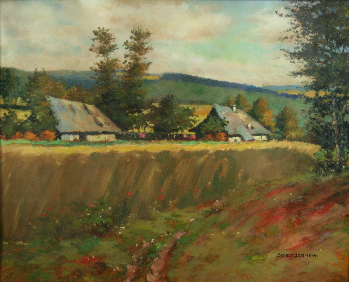 obraz chalupy v krajině, olej na lepence 32 x 41 cm s rámem 48 x 57 cm, autor Jan Streer podepsáno vpravo dole Jan Streer 1944, rámováno v původním rámu pod sklem