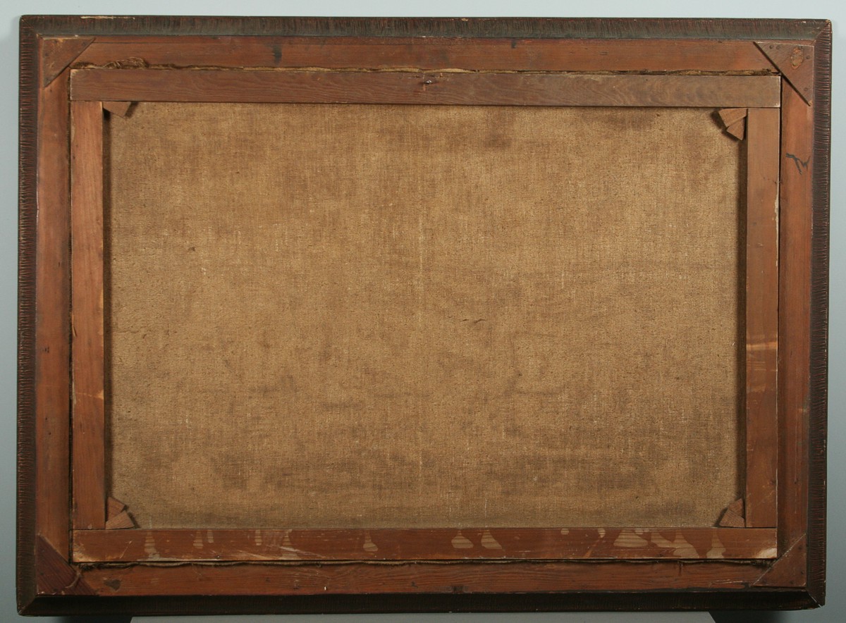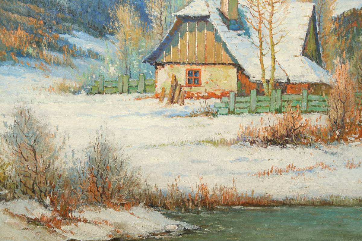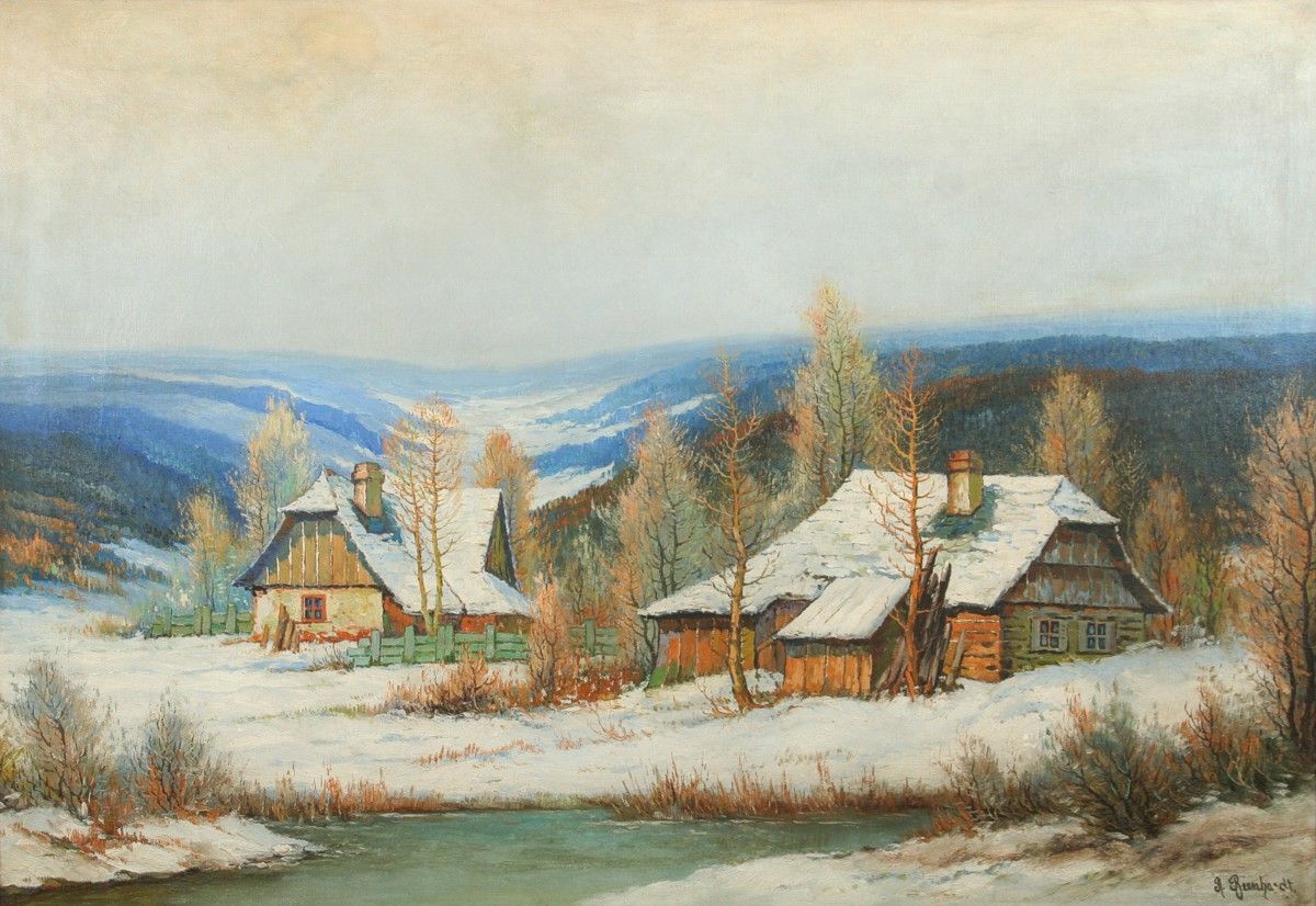 obraz krajiny s chalupami, olej na plátně 67 x 97 cm s rámem 84 x 114 cm, autor Rudolf Bernhardt, podepsáno vpravo dole R. Bernhardt, rámováno v původním rámu