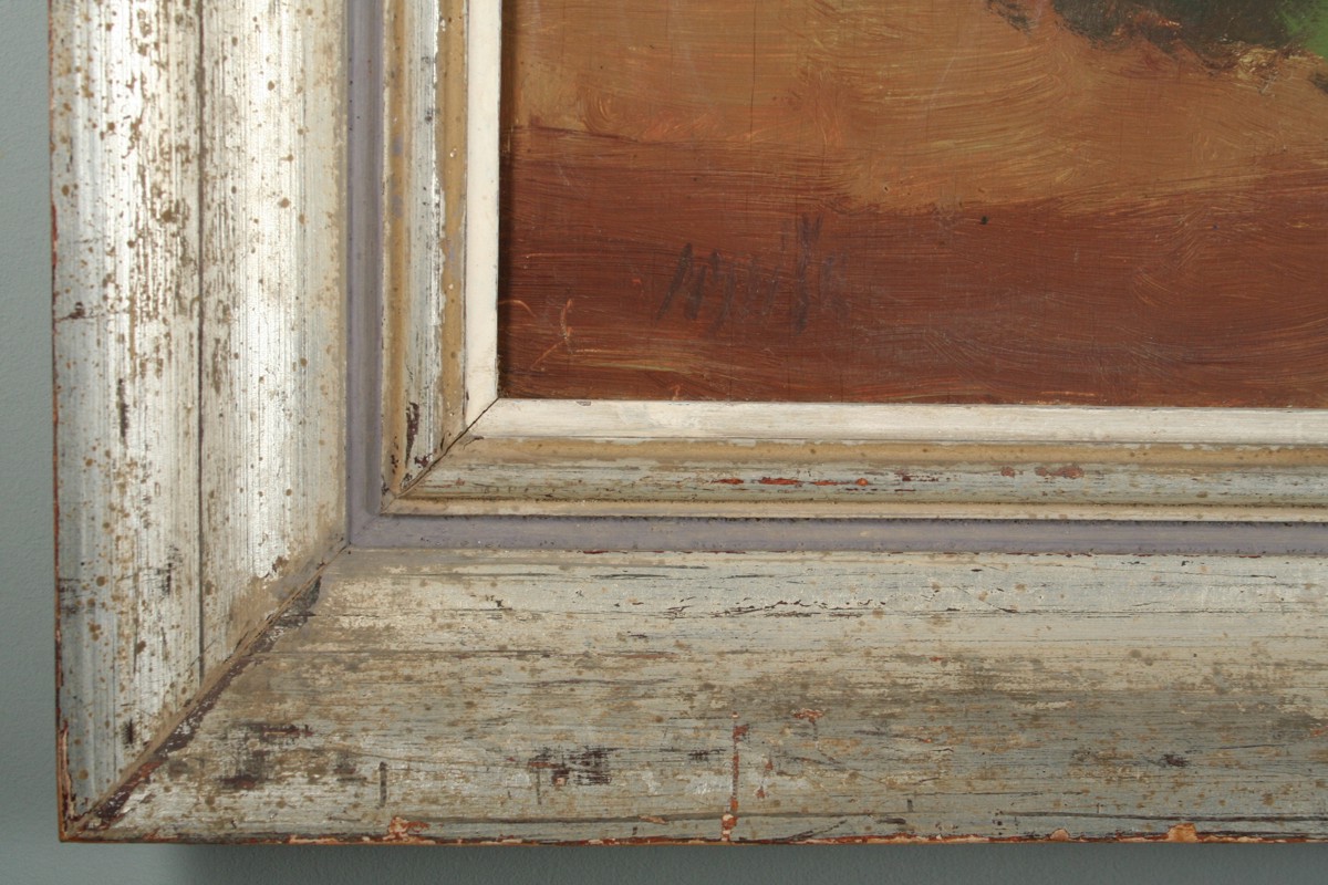 oboustraný obraz krajiny s vesnicí a na zadní straně běžící voják s puškou, olej na desce z překližky, 62 x 84 cm s rámem 80 x 102 cm, autor Jan Bohumil Pospíšil, podepsáno vlevo dole Pospíšil a J.B. Pospíšil, rámováno v původním rámu