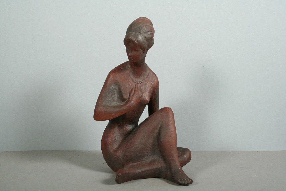 socha sedícího dívčího aktu s náhrdelníkem, pálená terakota, 50. léta, autor Bohumil Kokrda, 35 cm