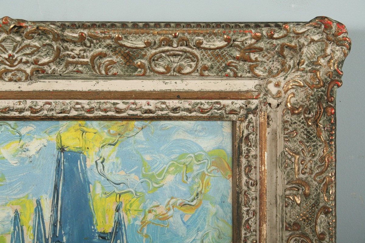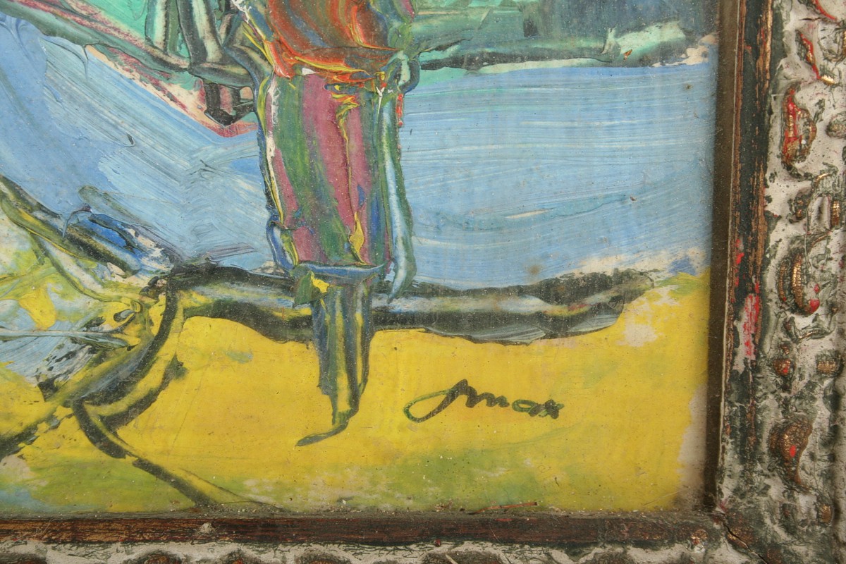 obraz Kampy, pohled na Mosteckou věž a část Karlova mostu v Praze s figurální stafáží, olej na lepence, 43 x 33 cm s rámem 58 x 48 cm, autor František Max, podepsáno vpravo dole fmax, rámováno v původním zdobeném rámu pod sklem