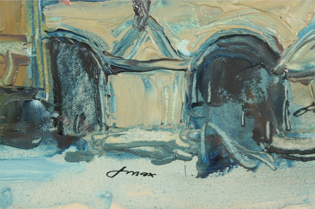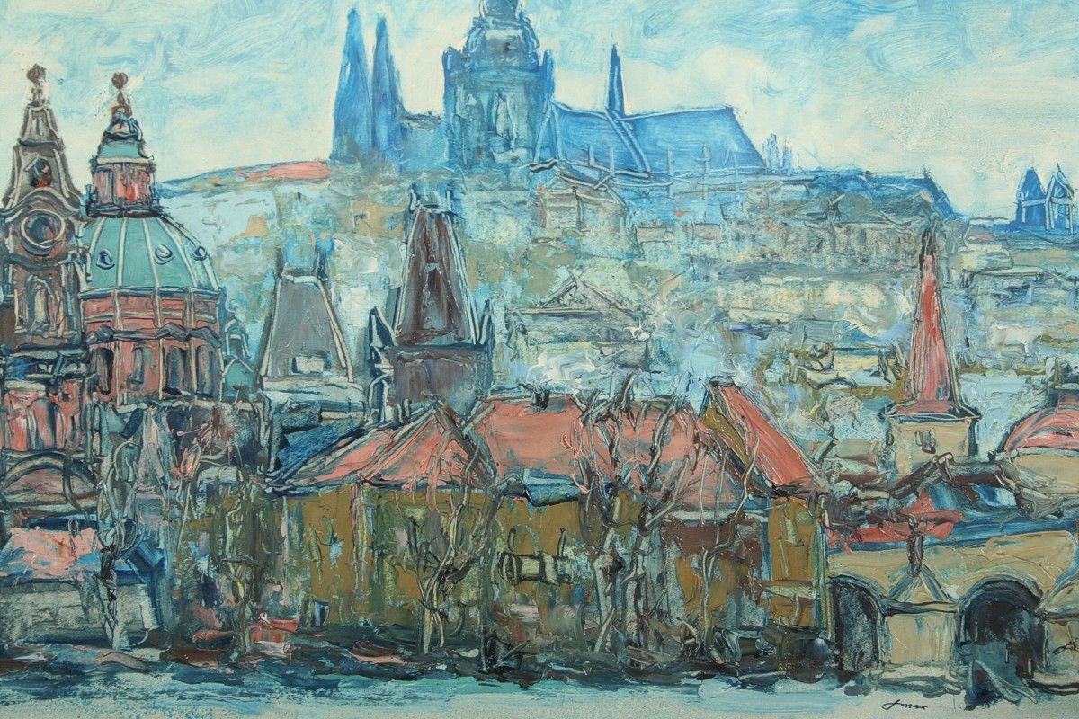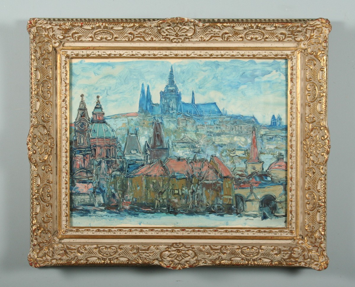 obraz Prahy, pohled na Malou stranu a Hradčany, olej na lepence, 33 x 43 cm s rámem 58 x 48 cm, autor František Max, podepsáno vpravo dole fmax, rámováno v původním zdobeném rámu pod sklem