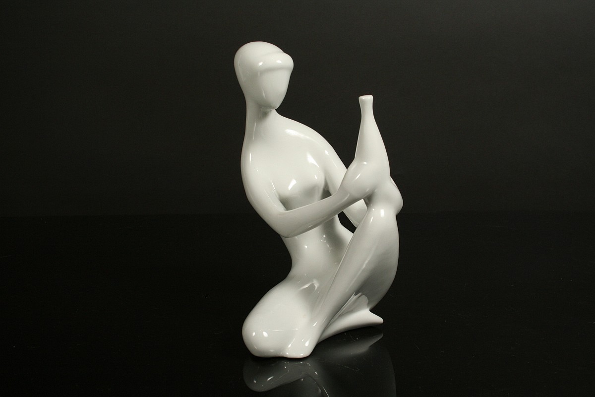 soška dívčího aktu s vázou, bílý glazovaný porcelán, autorka návrhu Jitka Forejtová, značené na dně starou tištěnou značkou Royal DUX Duchcov 60. léta 20. století, koncem 70. let se již tato značka nepoužívala, tzv bruselský styl, výška 21,5 cm