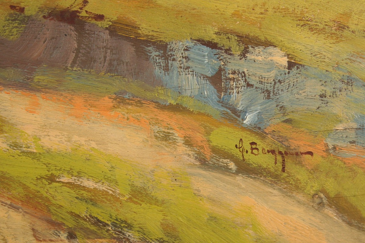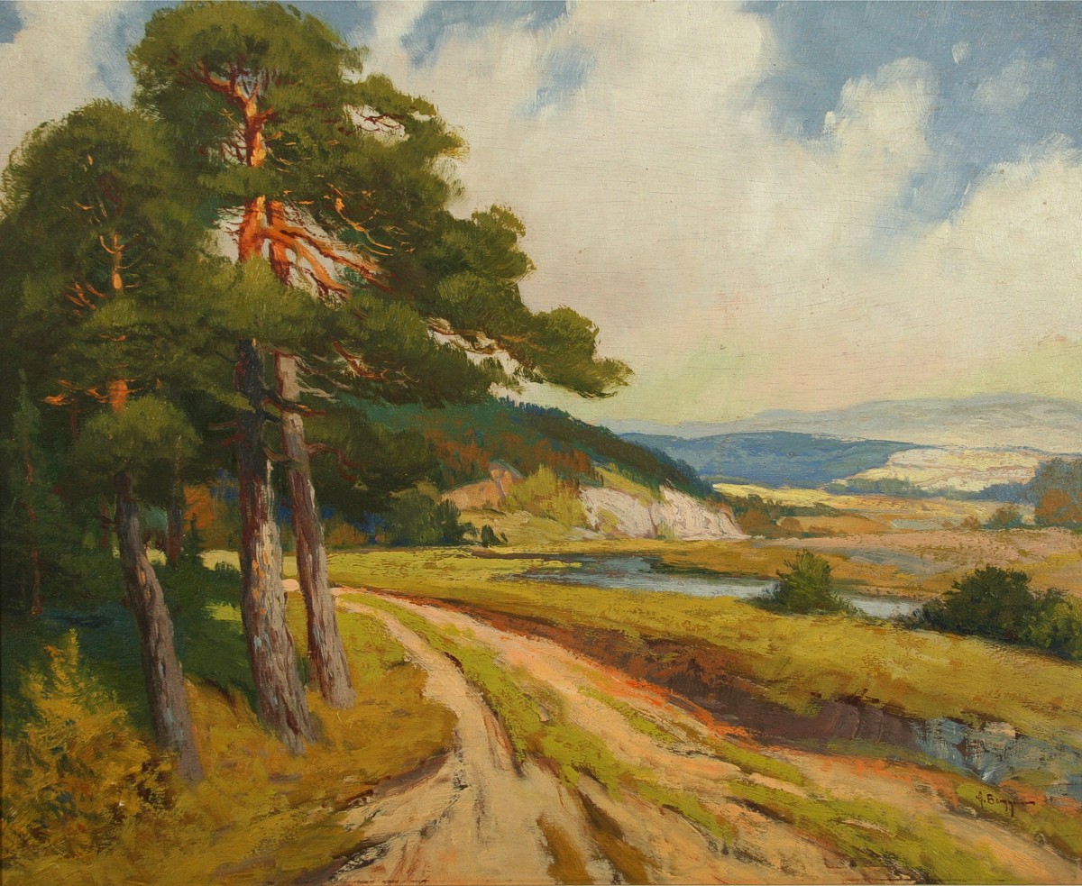 obraz rozlehlé krajiny s borovicemi cestou a vodou, olej na dřevěné překližkové desce, 54 x 67 cm s rámem 67 x 80 cm, autor Bohumil Berghauer (Horyna), podepsáno vpravo dole G. Berhauer, na zadní straně nečitelné výstavní razítko a číslo, rámováno