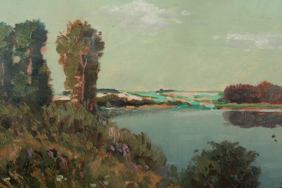 obraz krajiny s vodní hladinou, olej na lepence, ve výřezu 23 x 37 cm s rámem 39 x 64 cm, autor Ladislav Ehrlich, podepsáno vpravo dole L. Ehrlich, rámováno v původním řezaném rámu pod sklem