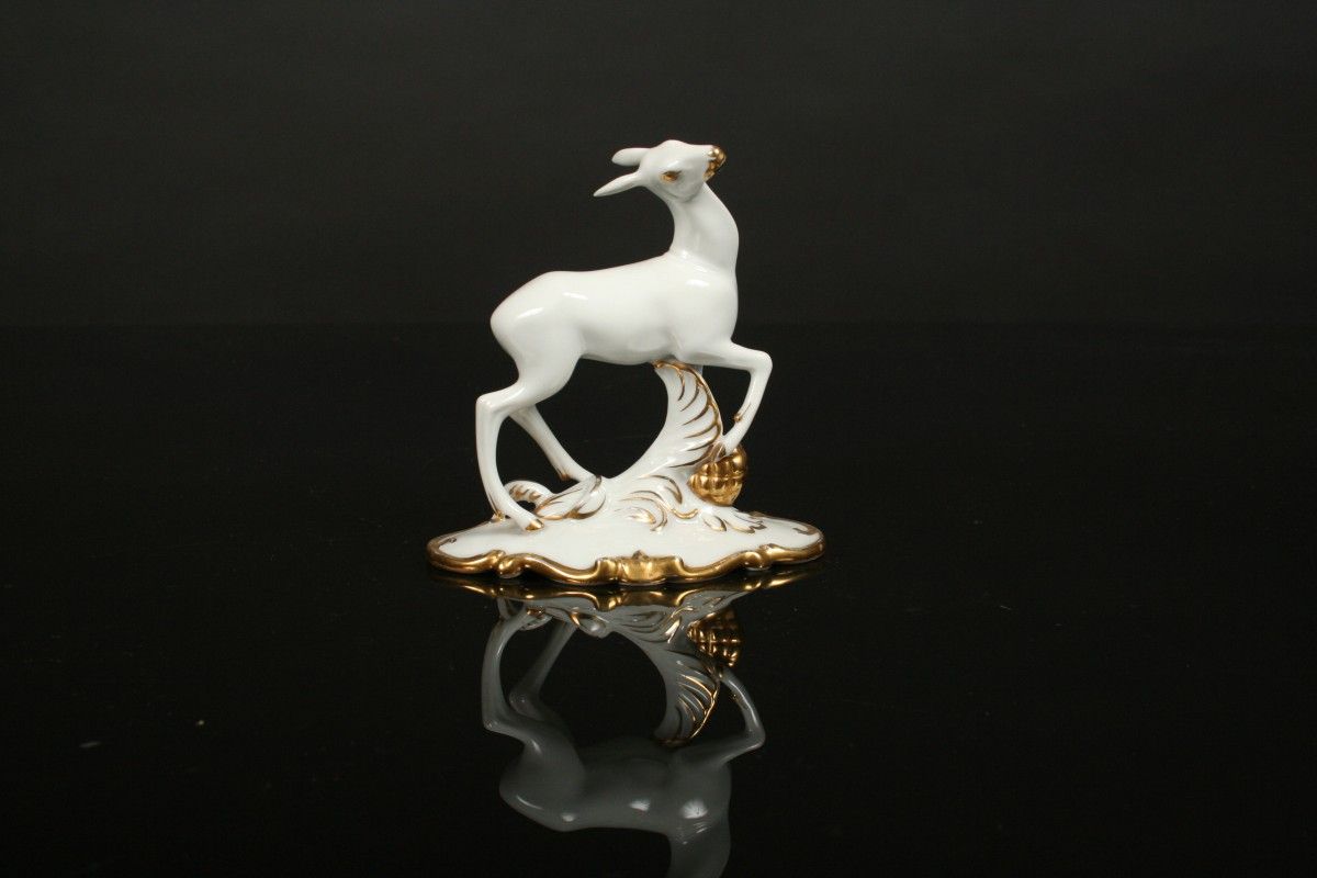 umělecká soška srnky z porcelánu, bílý porcelán se zlacenými detaily, značená na dně čísly a značkou Schlaggenwald Slavkov, 11 cm