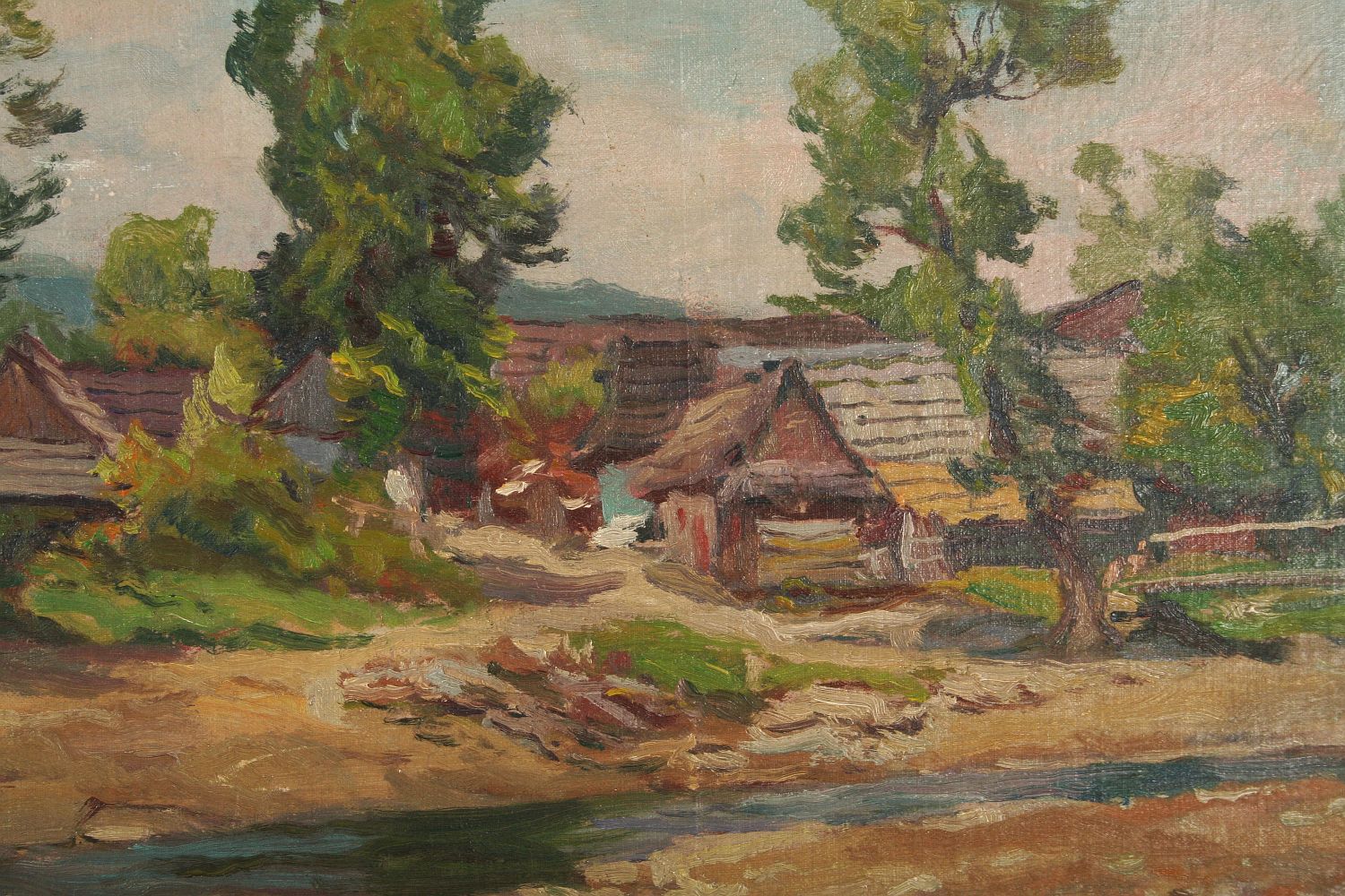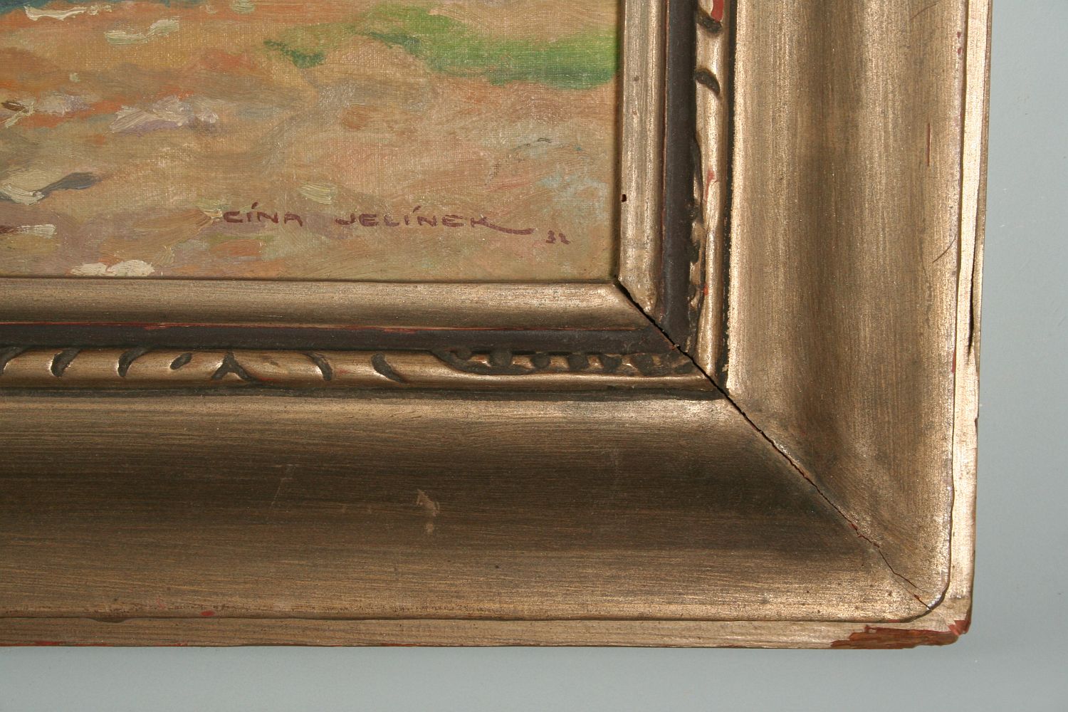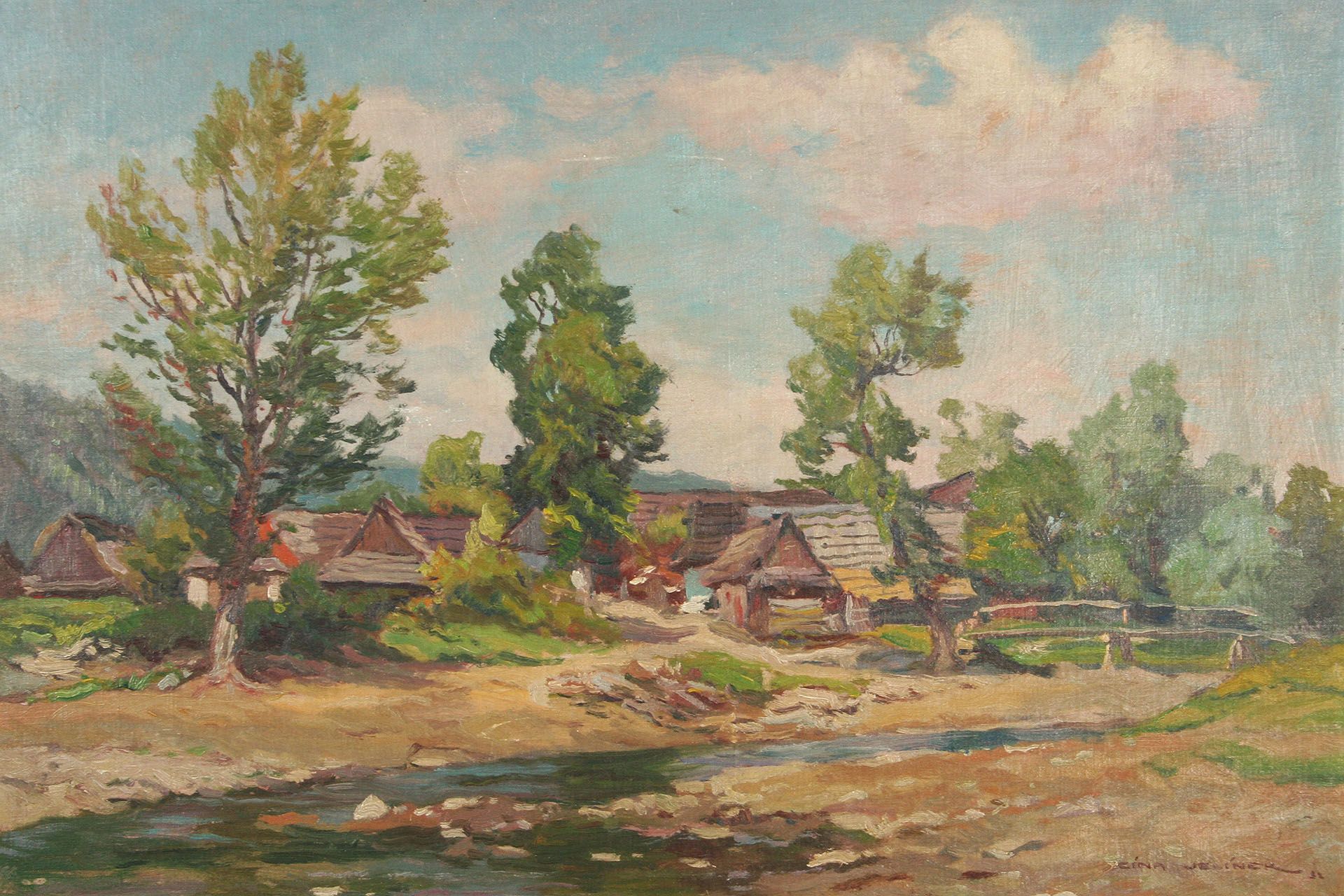obraz letní krajiny patrně z Vysočiny s vodou a chloupkami, olej na plátně lepeném na kartonu, 35 x 50 cm s rámem 51 x 66 cm, autor Cína Jelínek, podepsáno vpravo dole Cína - Jelínek 32, rámováno v původním rámu