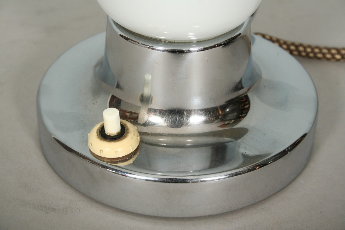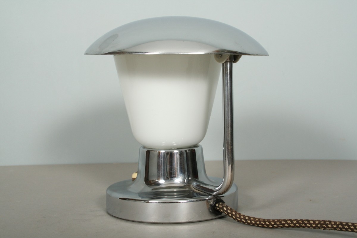 lampa na stůl, nebo noční stolek, kovová chromovaná, skleněný původní širm, výrobce Napako, vše původní pěkný stav, 20 x 19 cm