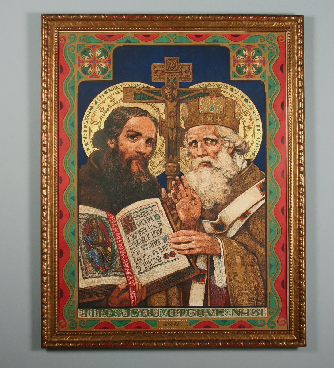 velká barevná litografie Cyrila a Metoděje se zlacenou svatozáří, 78 x 60 cm s rámem 86 x 68 cm, autor Jano Kohler, značeno v pravo dole LITH. Jano Kohler v desce, rámováno pod sklem