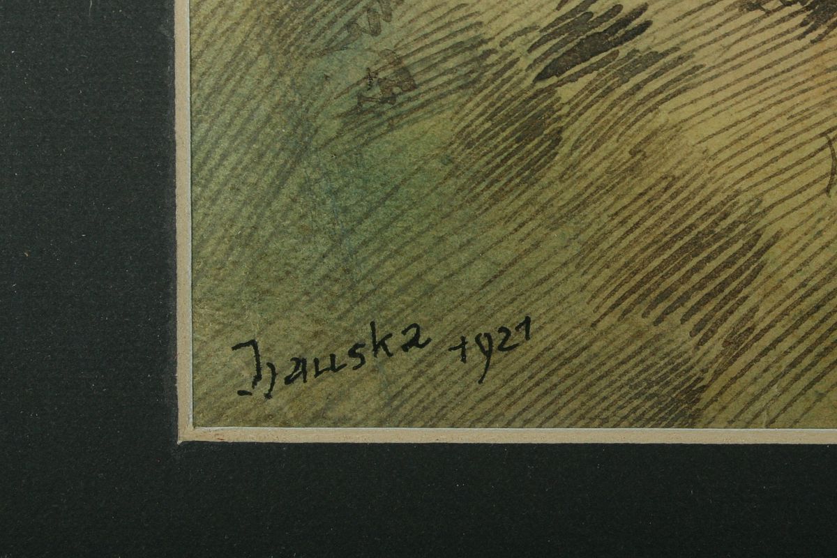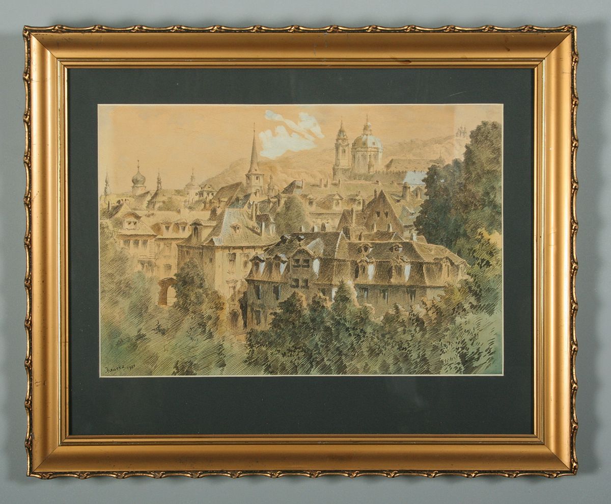 obraz staré Prahy, Malá Strana se sv. Mikulášem, kresba tuší a akvarelem na papíře, ve výřezu 28,5 x 42 cm s rámem 48 x 58 cm, autor Otakar Hauska, podepsáno vlevo dole Hauska 1921, rámováno v paspartě a rámu pod sklem