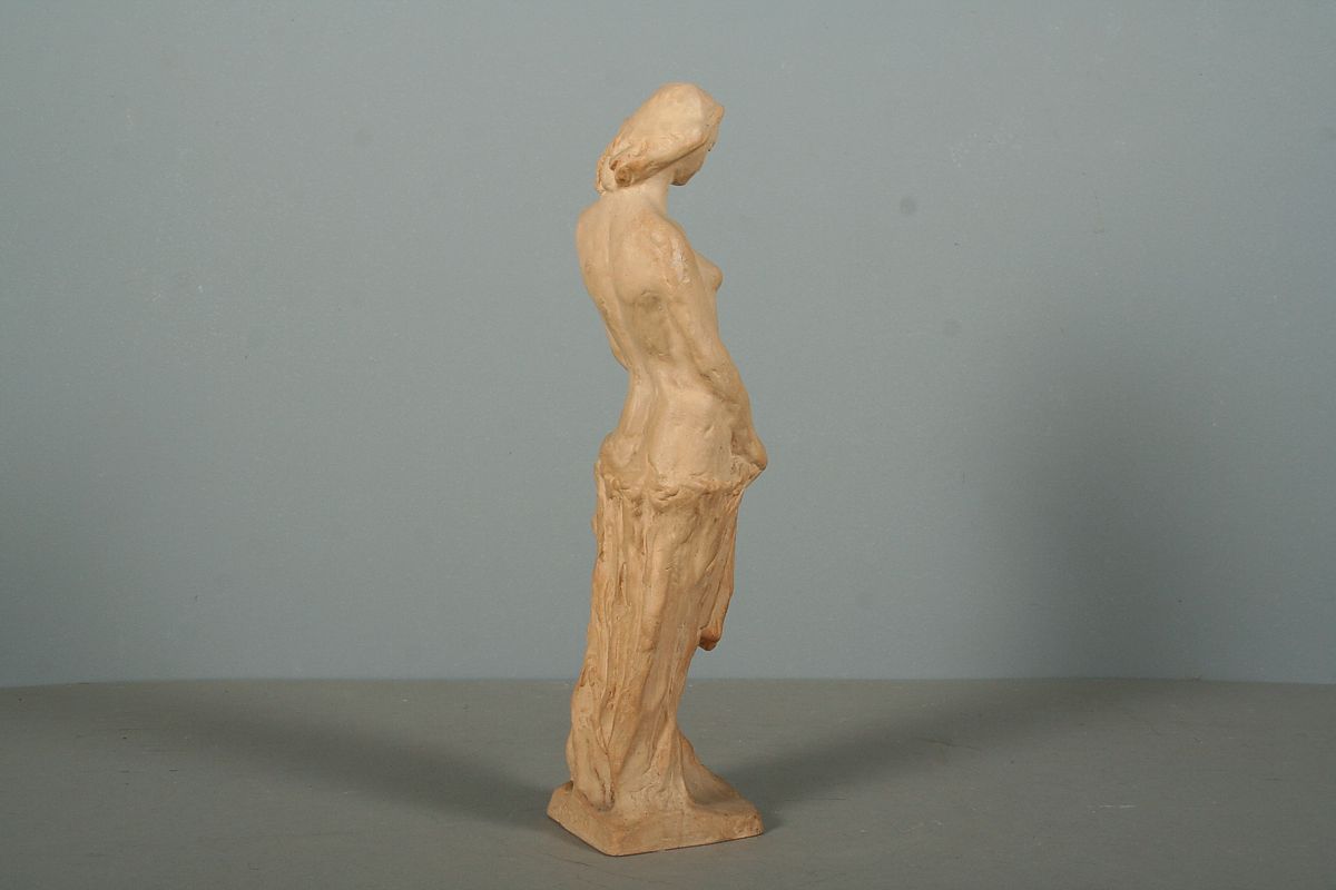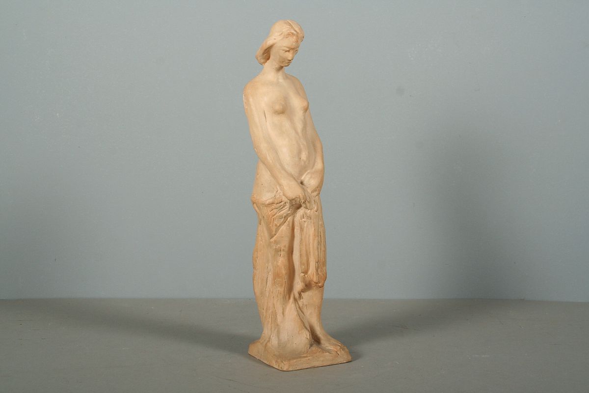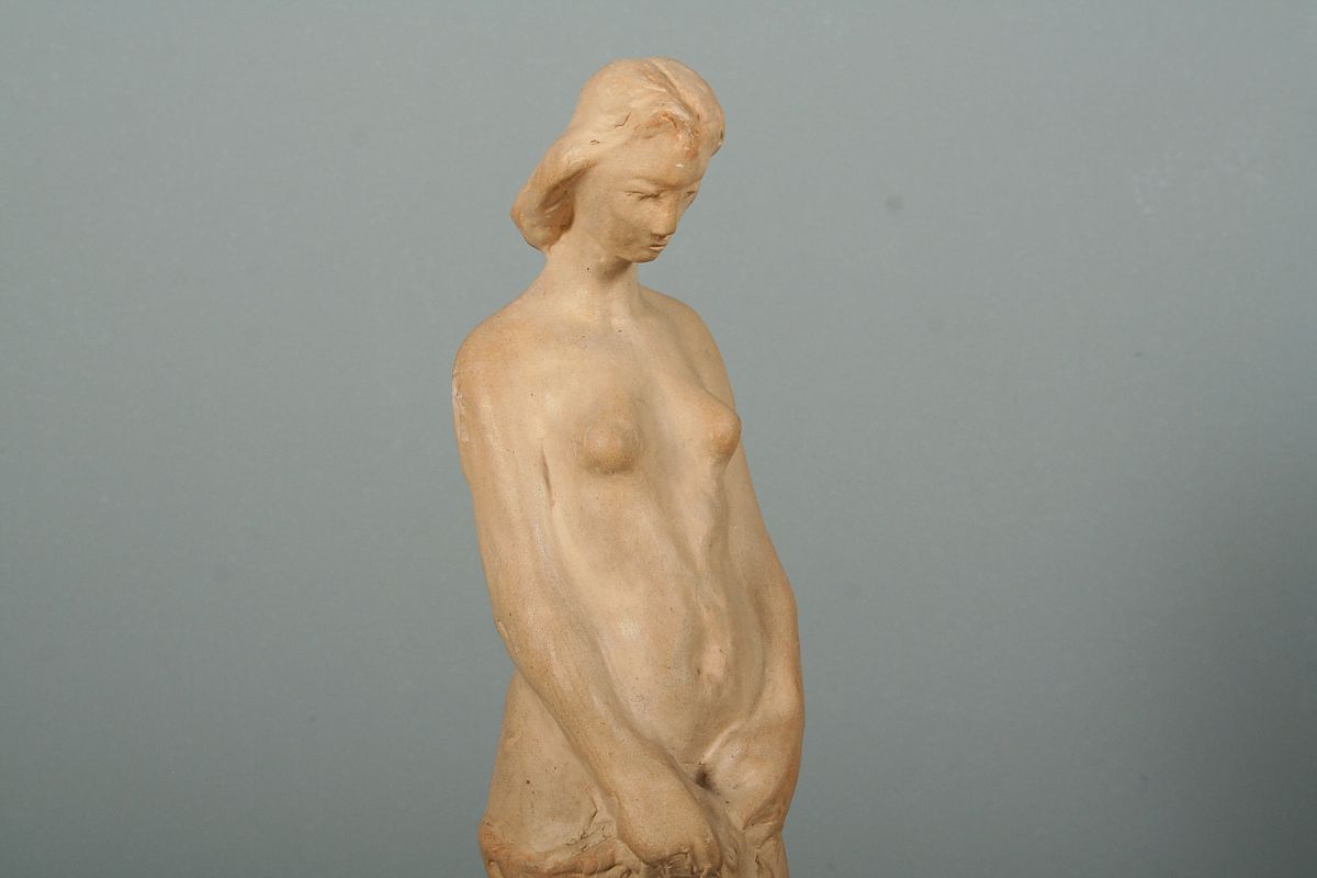 socha nahé dívky s drapérií, pálená hlína 31 cm, autor Jan Komárek, podepsáno dole na soklu J. Komárek