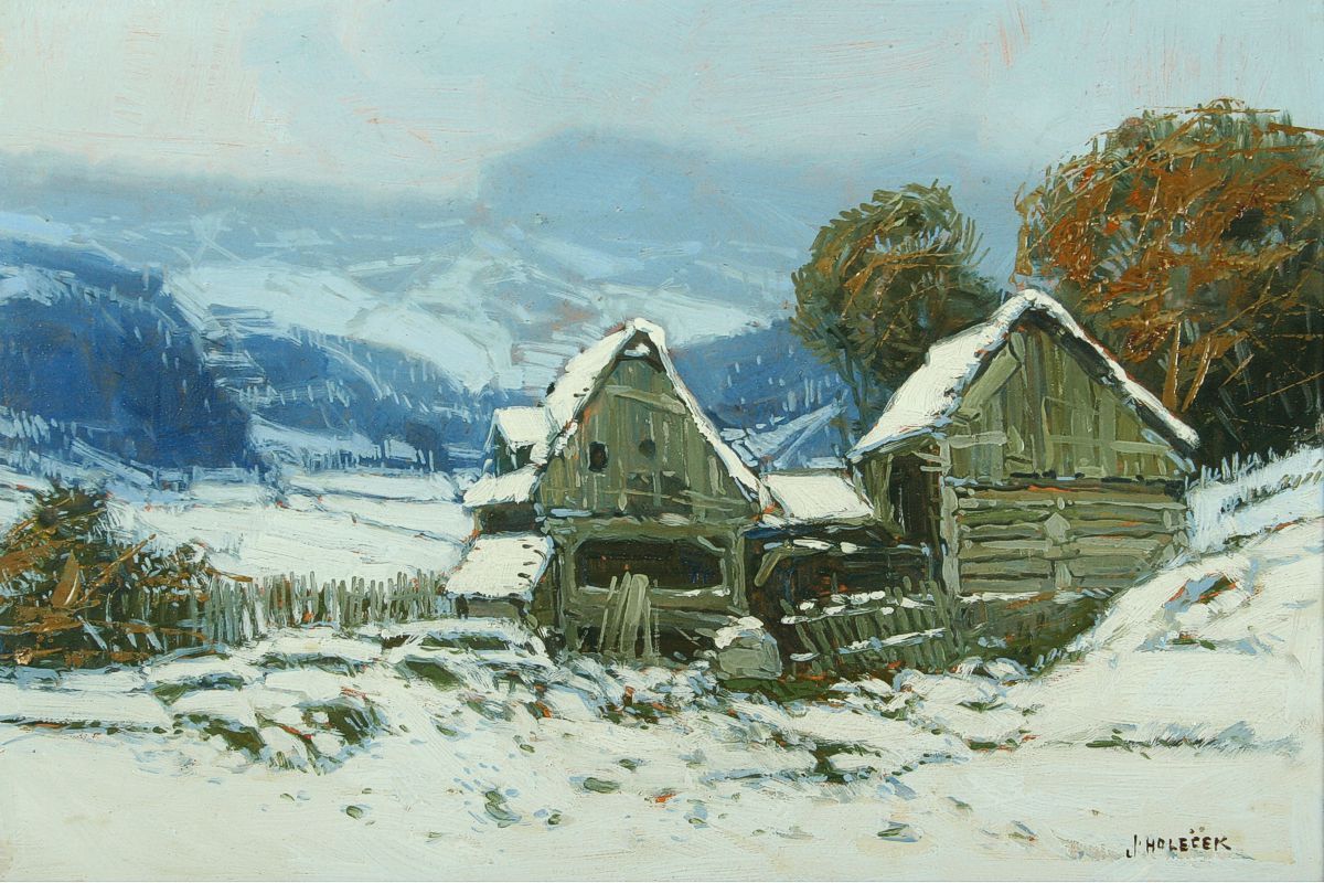 obraz zimní krajiny s chalupou v Orlických horách, olej na kartonu, 34 x 49 cm s rámem 42 x 57 cm, autor J. Holeček, podepsáno vpravo dole J. Holeček, rámováno v původním řezaném rámu