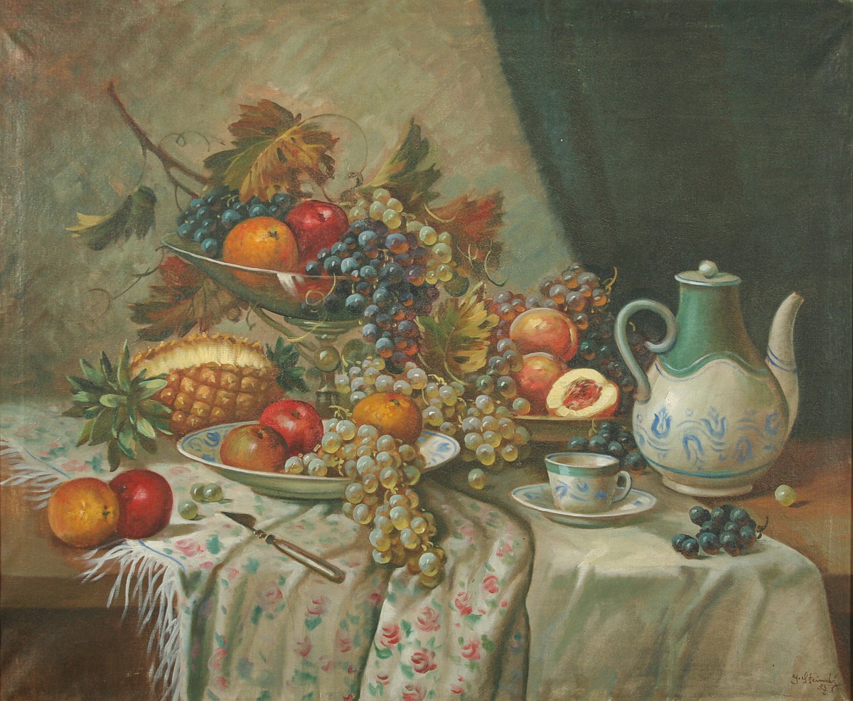 velké zátiší s konvicí, šálkem a množstvím ovoce na stole s drapérií, olej na plátně, 80 x 95 cm, s rámem 93 x 110 cm, autor Josef Steinský, podepsáno vpravo dole J. Stejnský 37, rámováno