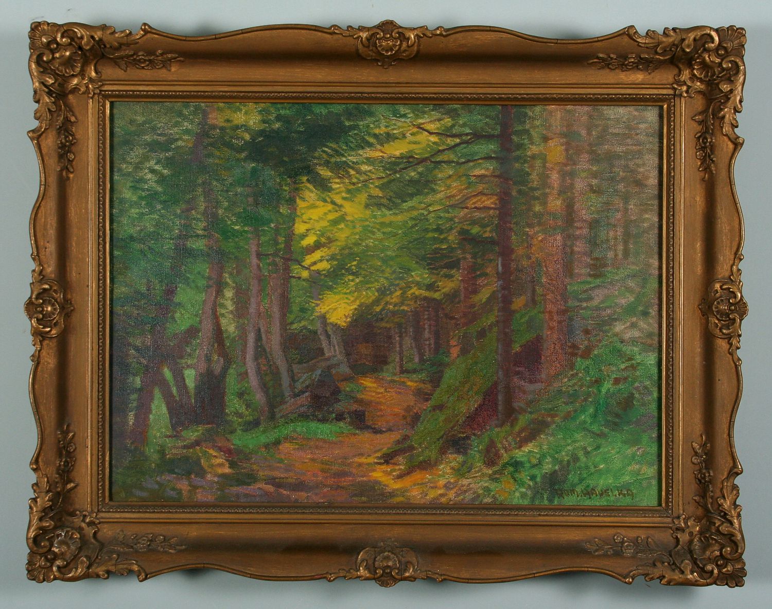 obraz lesa s lesní cestou, olej na plátně 40 x 54,5 cm s rámem 52 x 67 cm, autor Roman Havelka, podepsáno vpravo dole Rom. Havelka, rámováno v původním zdobeném rámu, obraz byl vystavovaný krajskou galerií GVUN a je celostránkově barevně publikovaný