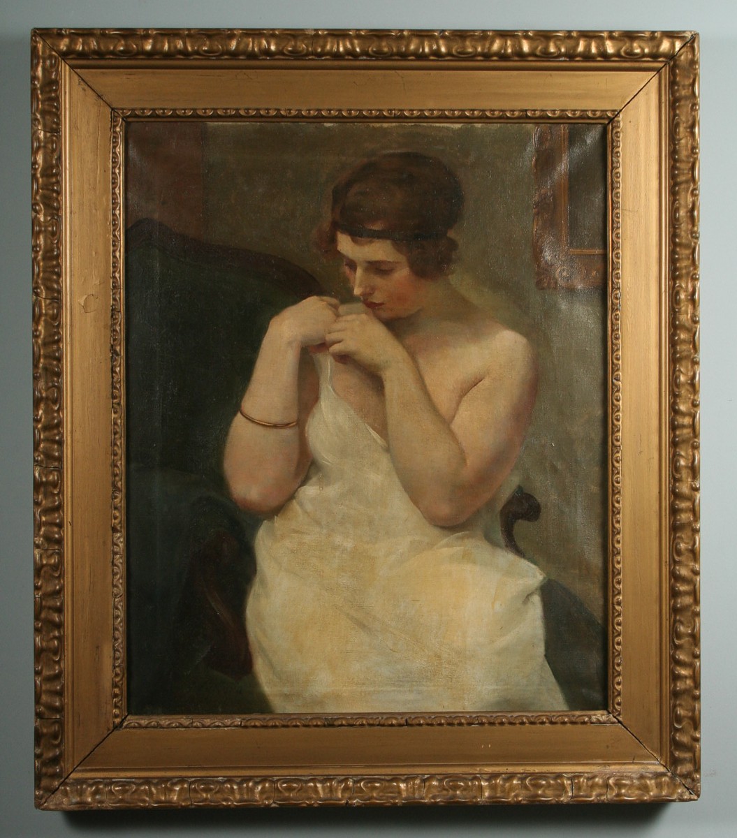 obraz cudné dívky při raní toaletě v interieru, olej na plátně 78 x 64 cm s rámem 98 x 84 cm, autor Gustav Sýkora, podepsáno vlevo dole G. Sýkora, rámováno v původním zdobeném rámu, obraz pochází z významné náchodské pozůstalosti