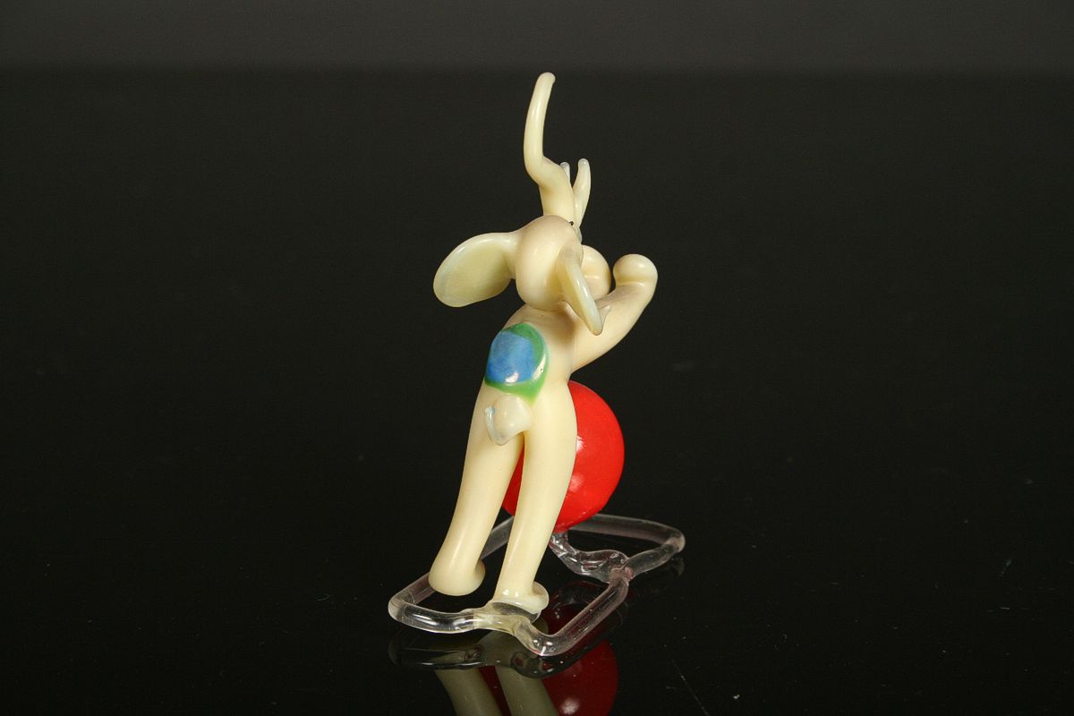 figurka slona vzpínajícího se nad červenou koulí, foukané vícebarevné sklo styl art deco, v perfektním stavu, autor Jaroslav Brychta 20.-30. léta 20. století sklárny Železný Brod, 8 cm