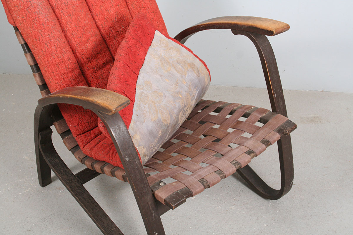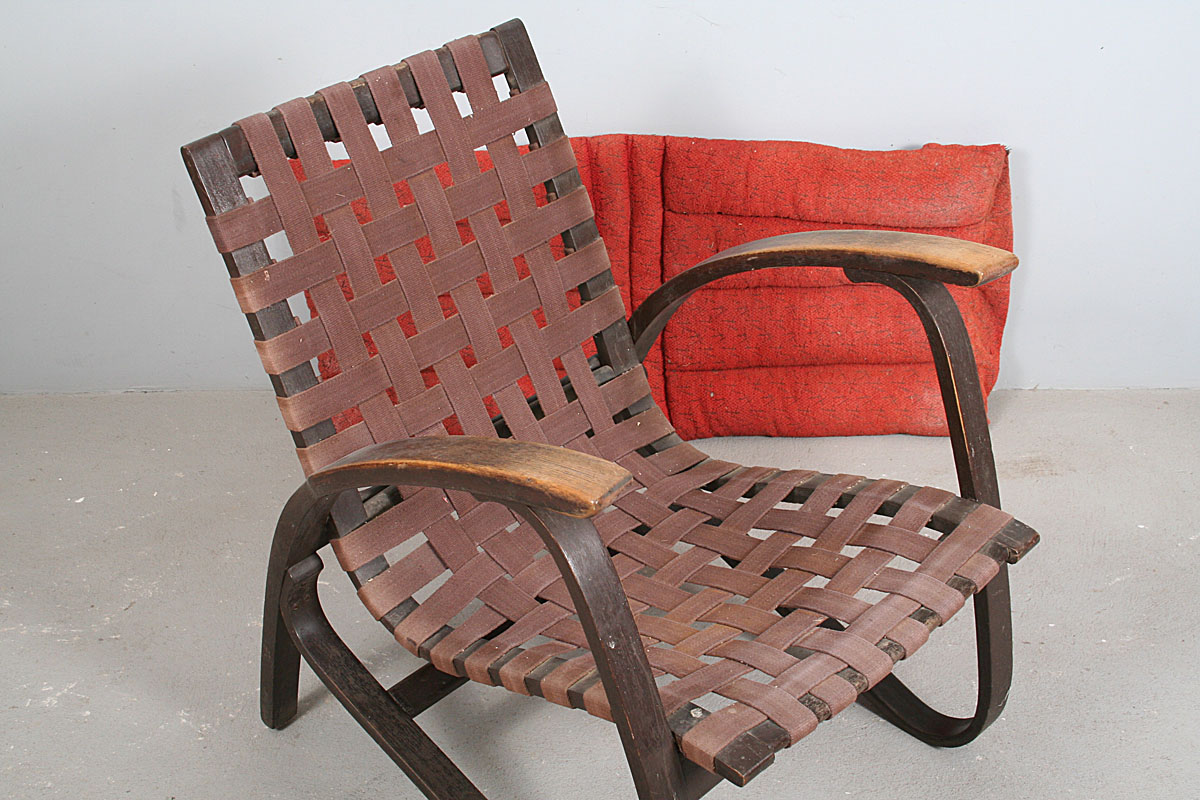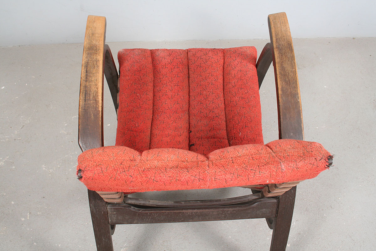 ikonické křeslo design Jan Vaněk, ohýbané mořené bukové dřevo avantgardních tvarů, původní polstrování uchycené ke křeslu pouze v horní části opěrky, popruhy nepotrhané, dřevo nepopraskané, konstrukce nerozviklaná, velmi příjemný posed, područky a lak omšelé, 78 x 62 x 77 cm