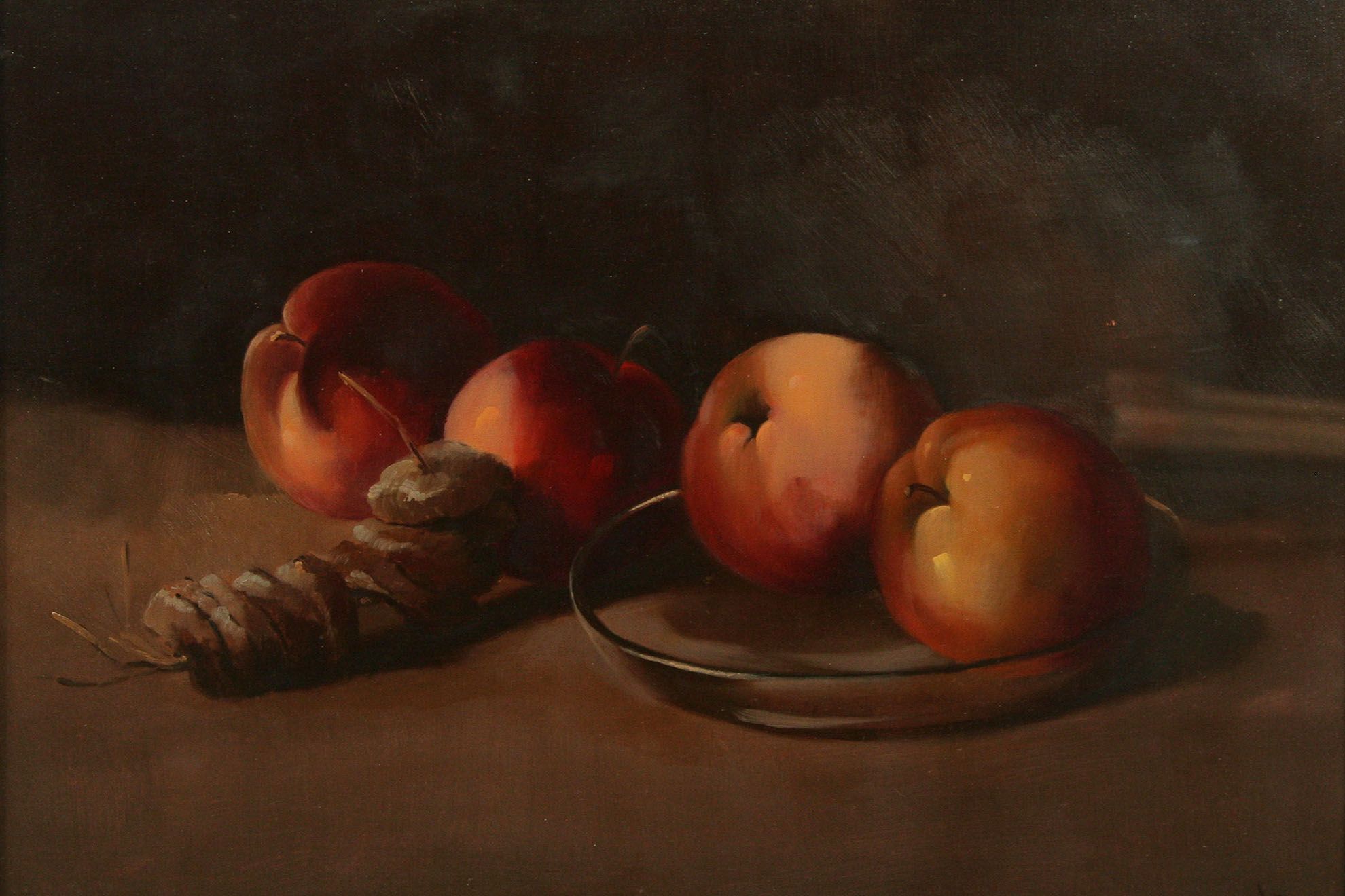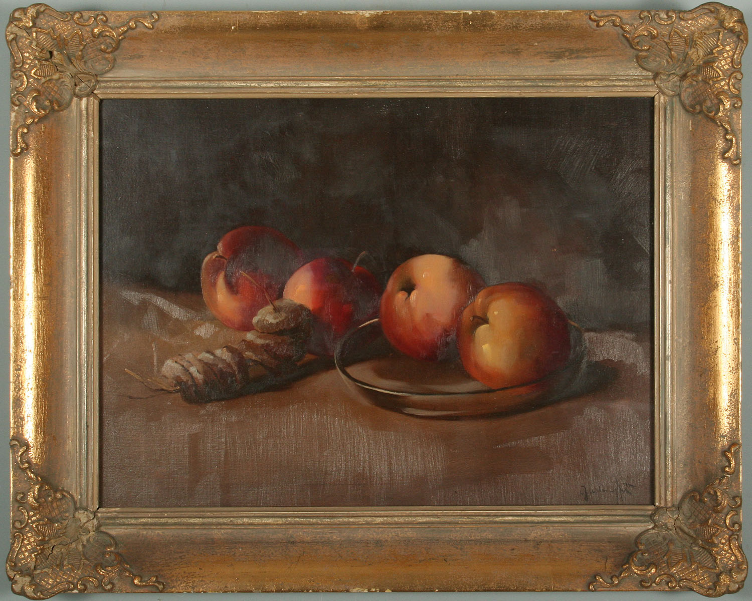 zátiší s miskou jablky a fíky, olej na kartonu 30 x 40 cm s rámem 41 x 51 cm autor Jiří Balling, podepsáno vpravo dole Balling Jiří, na zadní straně autorské razítko s přípisem, rámováno v původním zdobeném rámu pod sklem