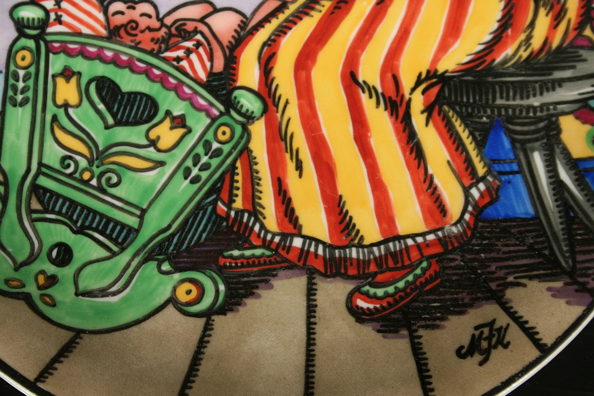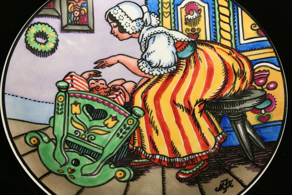 porcelánový závěsný talíř, ručně malovaný motiv Marie Fišerové-Kvěchové, značeno vpravo MFK, na zadní straně značka porcelánu, průměr 21,5 cm