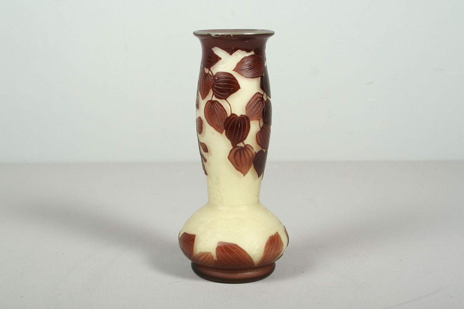 secesní skleněná váza s odleptávaným plastickým motivem květů, značená na patce Loetz, výroba Klášterský Mlýn, Johann Lötz Witwe, v původním nepoškozeném stavu z počátku 20. století, 18,5 cm