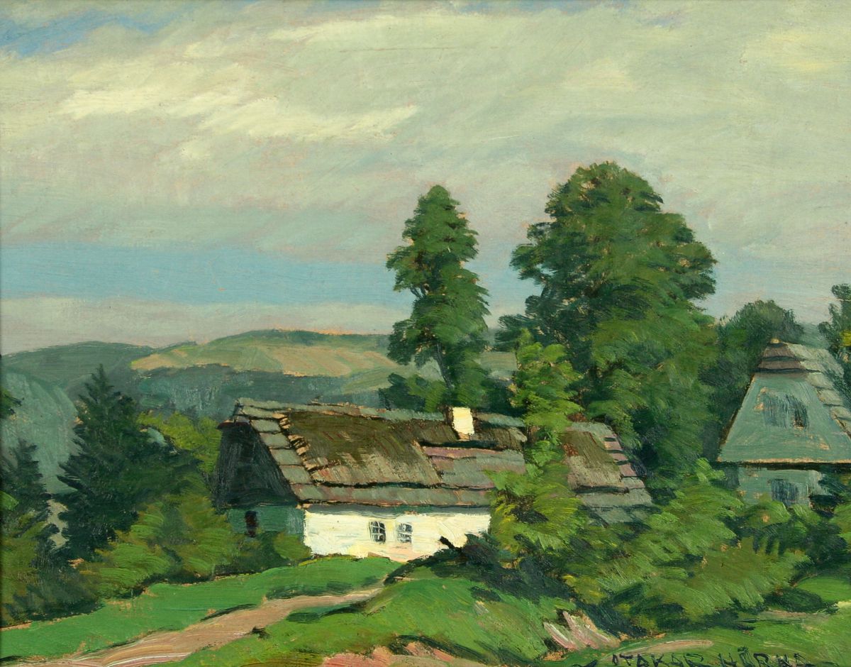 obraz letní krajiny s chalupami, olej na kartonu, 33 x 43 cm, s rámem 49 x 59 cm, autor Otakar Hůrka, obraz zachycující krajinu v koloritu a výrazu jeho učitele A. Kalvody, podepsáno vpravo dole Otakar Hůrka, rámováno