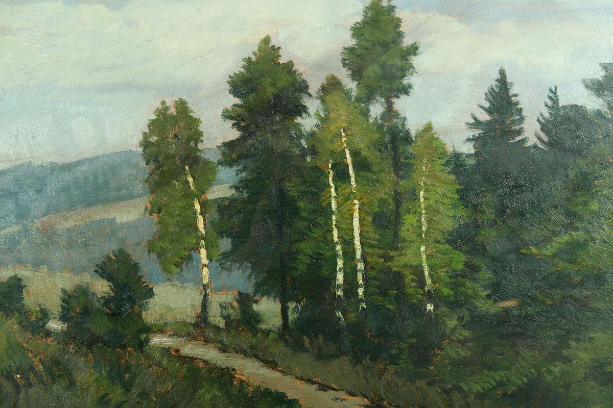 obraz letní krajiny s břízkami a cestou, olej na kartonu, 34 x 45 cm, s rámem 46 x 57 cm, autor Otakar Hůrka, obraz zachycující krajinu v koloritu a výrazu jeho učitele A. Kalvody, podepsáno vpravo dole Otakar Hůrka, rámováno pod sklem