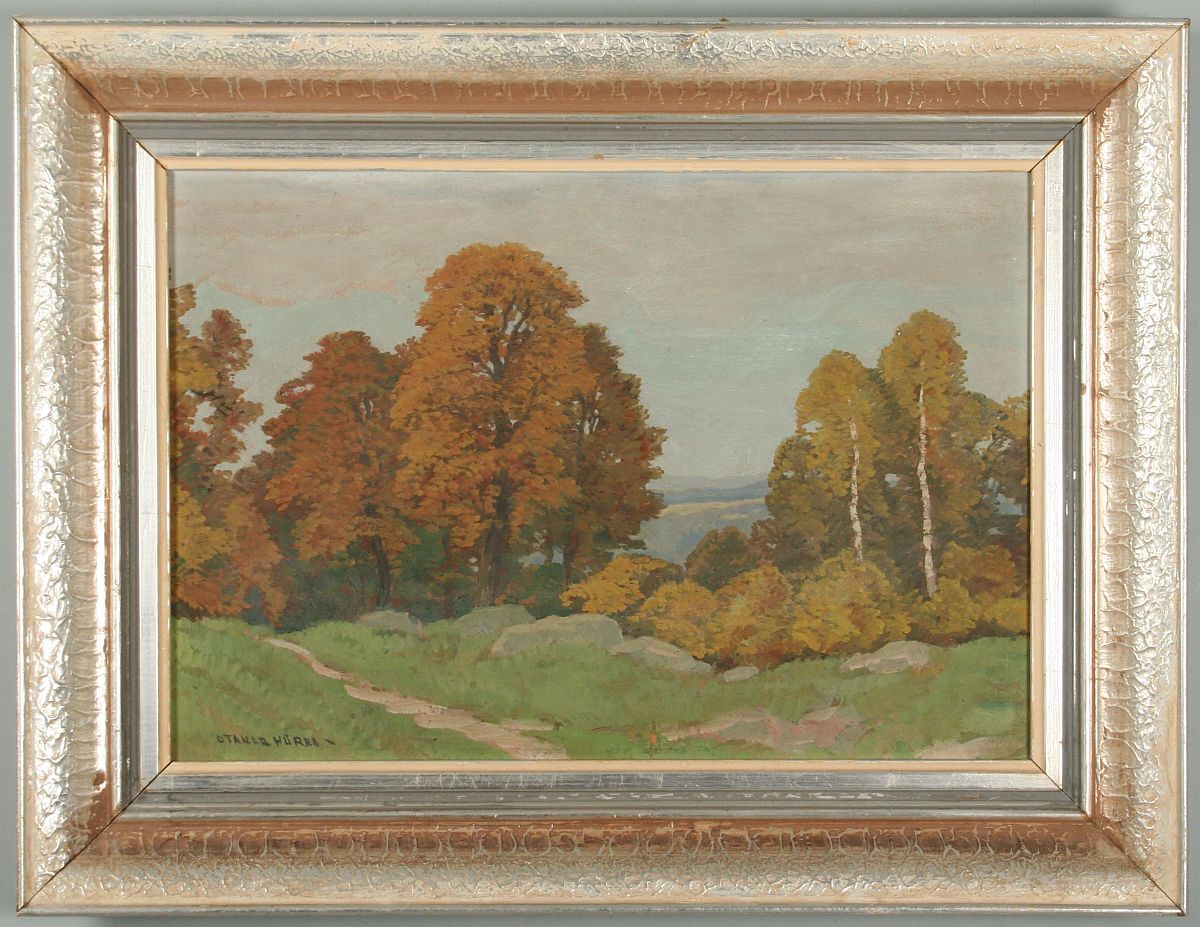 obraz krajiny s cestou, olej na kartonu, 34 x 49 cm, s rámem 49 x 64 cm, autor Otakar Hůrka, podepsáno vlevo dole Otakar Hůrka, rámováno v původním rámu