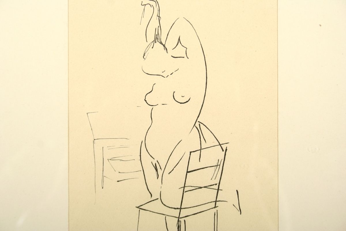 dívčí akt s židlí litografie na papíře, autor Rudolf Kremlička, podepsáno v tisku R.Kremlička 1919 a tužkou v pravo dole monogramem R K rámováno v paspartě pod sklem