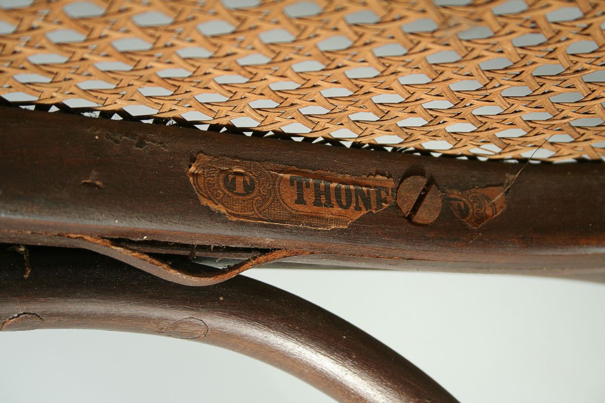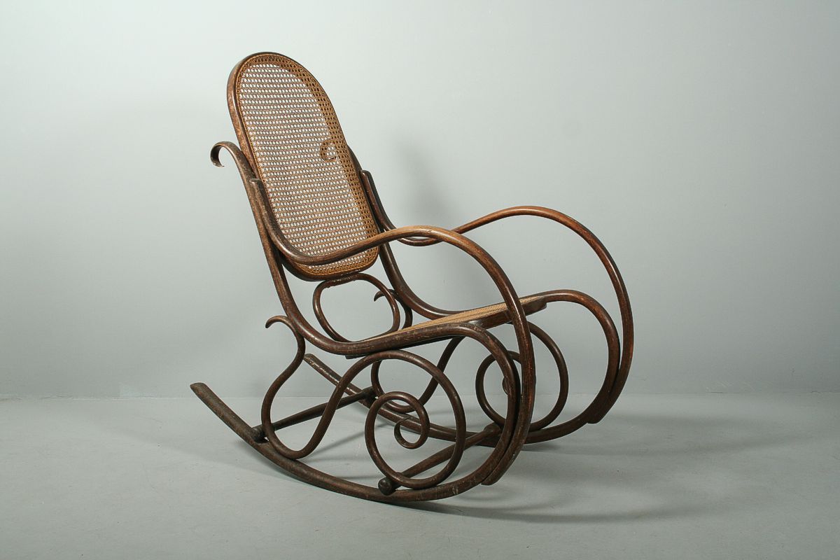 velké starožitné houpací křeslo z ohýbaného dřeva s původním ratanovým výpletem, značené vinětou Thonet, v pěkném původním stavu