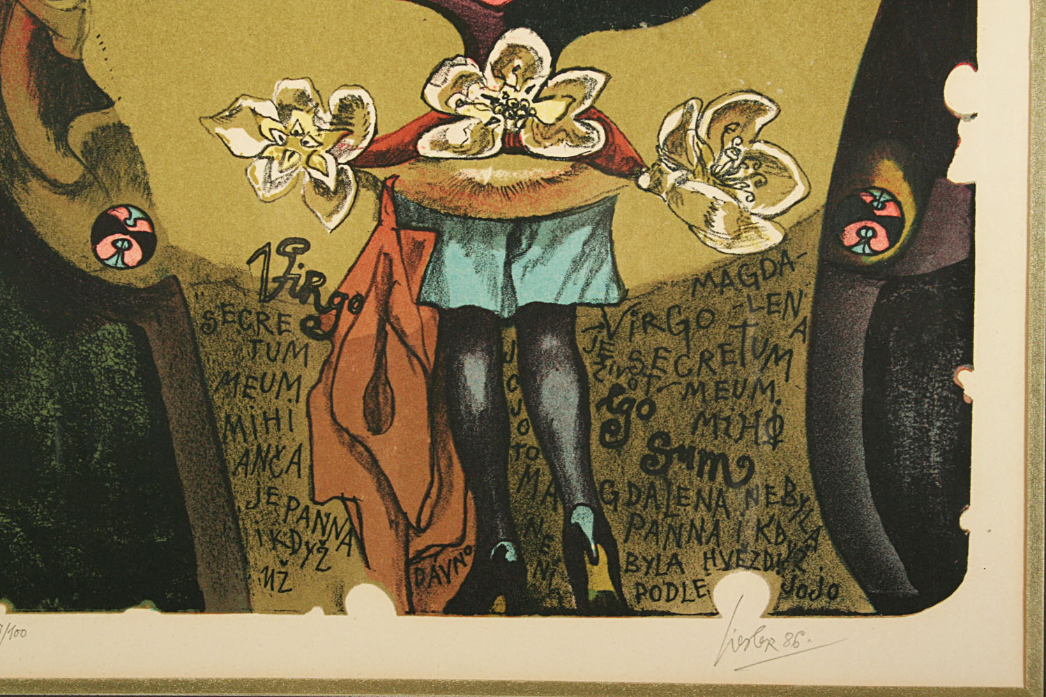 až surrealistické vyobrazení Virgo ego sum, litografie na papíře 26,6 x 21,3 cm s paspartou 46 x 38 cm, autor Josef Liesler, podepsáno vpravo dole Liesler 86, na zadní straně autorský přípis s dedikací, v původní paspartě pod sklem