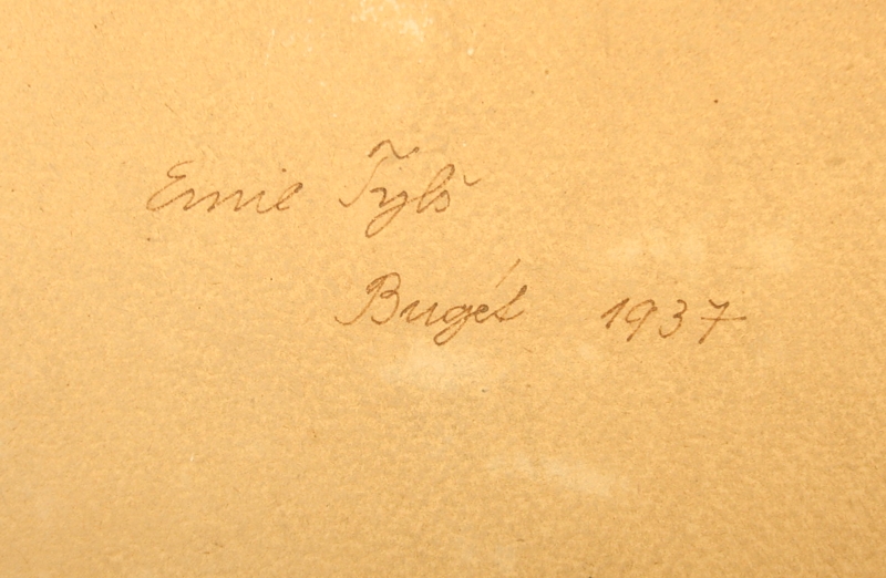 obraz kytice, olej na lepence, autor Emil Tylš, podesáno ze zadu s datací Emil Tylš Bugét 1937, nerámováno