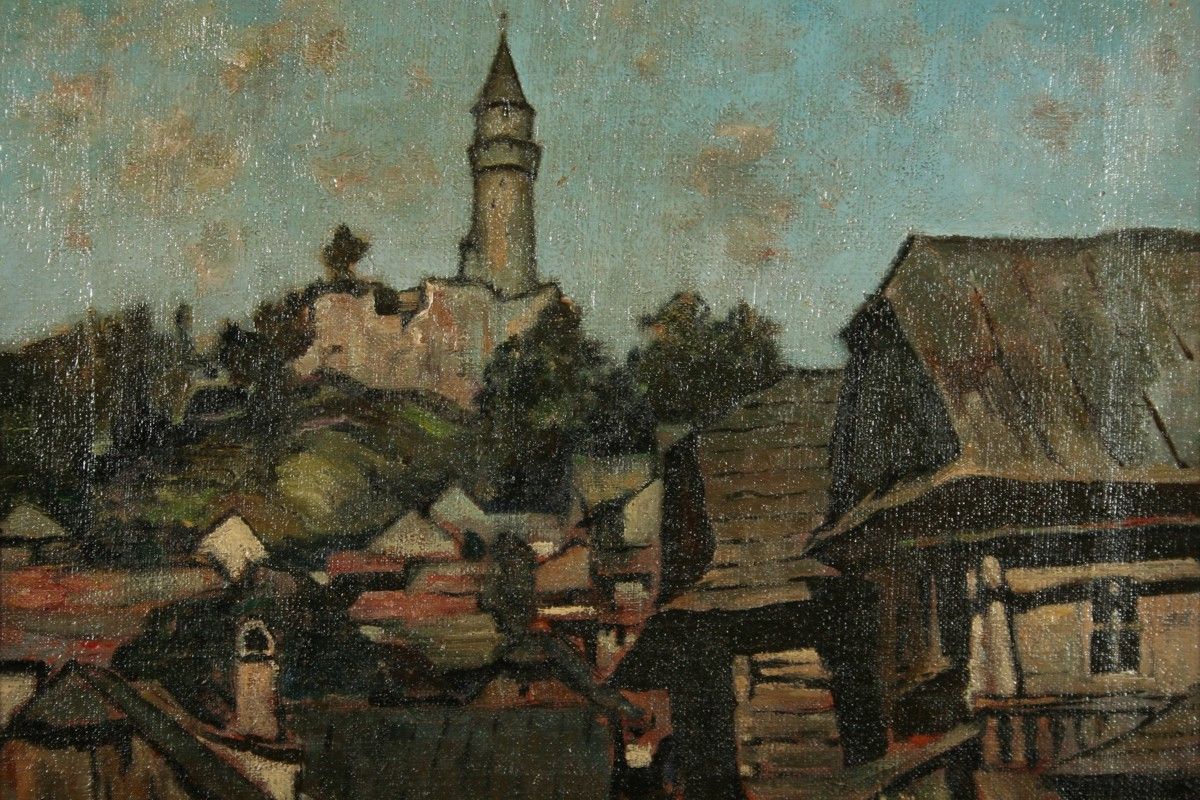 starý obraz Štramberk, olej na plátně 40 x 50 cm s rámem 57 x 66 cm, autor Emil Tylš podepsáno vpravo dole E. Tylš 52, vzadu přípis Štramberk 1952 červen, Emil Tylš, rámováno