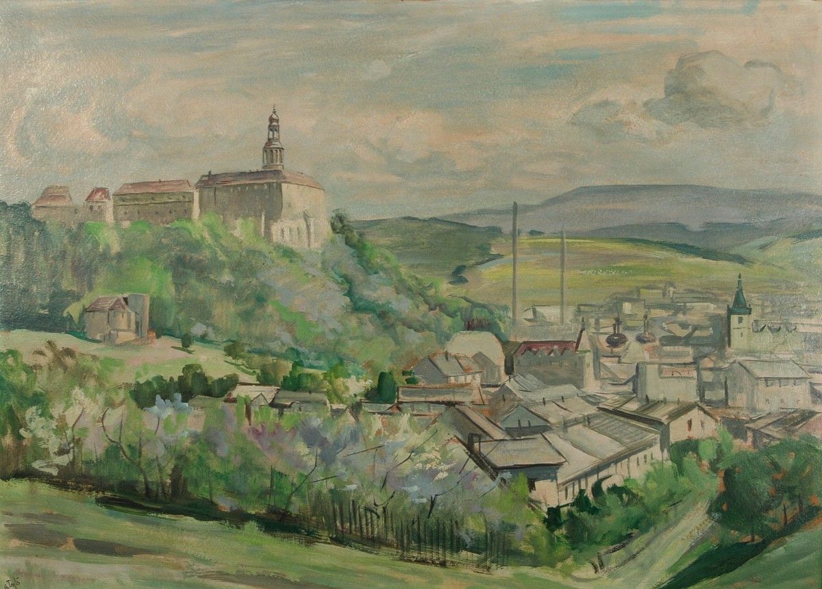 zámek nad městem Náchod, olej na lepence, ve výřezu 49 x 68 cm s rámem 64 x 84 cm, autor Emil Tylš podepsáno vlevo dole E. Tylš, rámováno v původním částečně poškozeném rámu