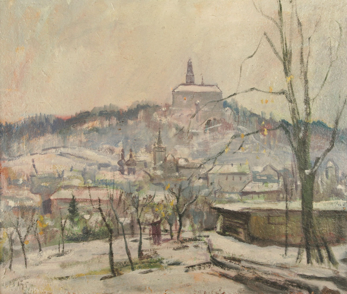zimní pohled na Náchod od jihu, olej na desce, ve výřezu 46 x 54 cm s rámem 58 x 66 cm, autor Emil Tylš, podepsáno vlevo dole E. Tylš, rámováno v původním částečně poškozeném rámu