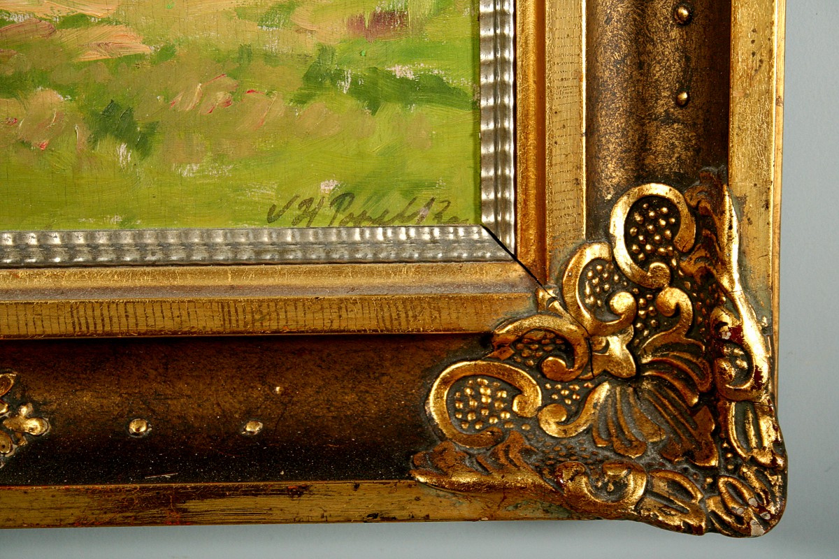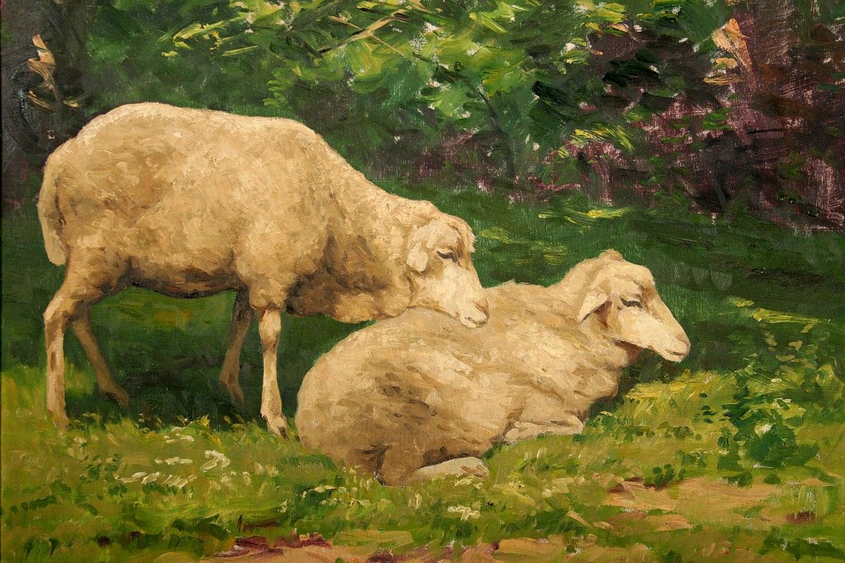 obraz oveček při odpočinku na slunci, olej na lepence 50 x 63 cm s rámem 71 x 83 cm, autor Vojtěch Popelka, podepsáno vpravo dole V.H. Popelka, rámováno v původním zdobeném rámu