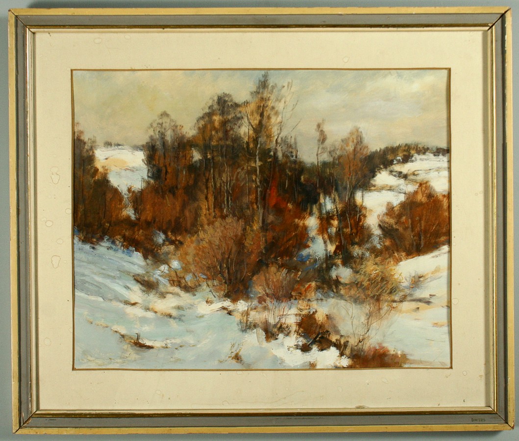 obraz zimní krajiny, olej tempera na lepence ve výřezu 36 x 45 cm s rámem 52 x 61 cm, autor Josef Vondráček, nepodepsáno, na zadní straně popisek autora, rámováno v paspartě a rámu pod sklem
