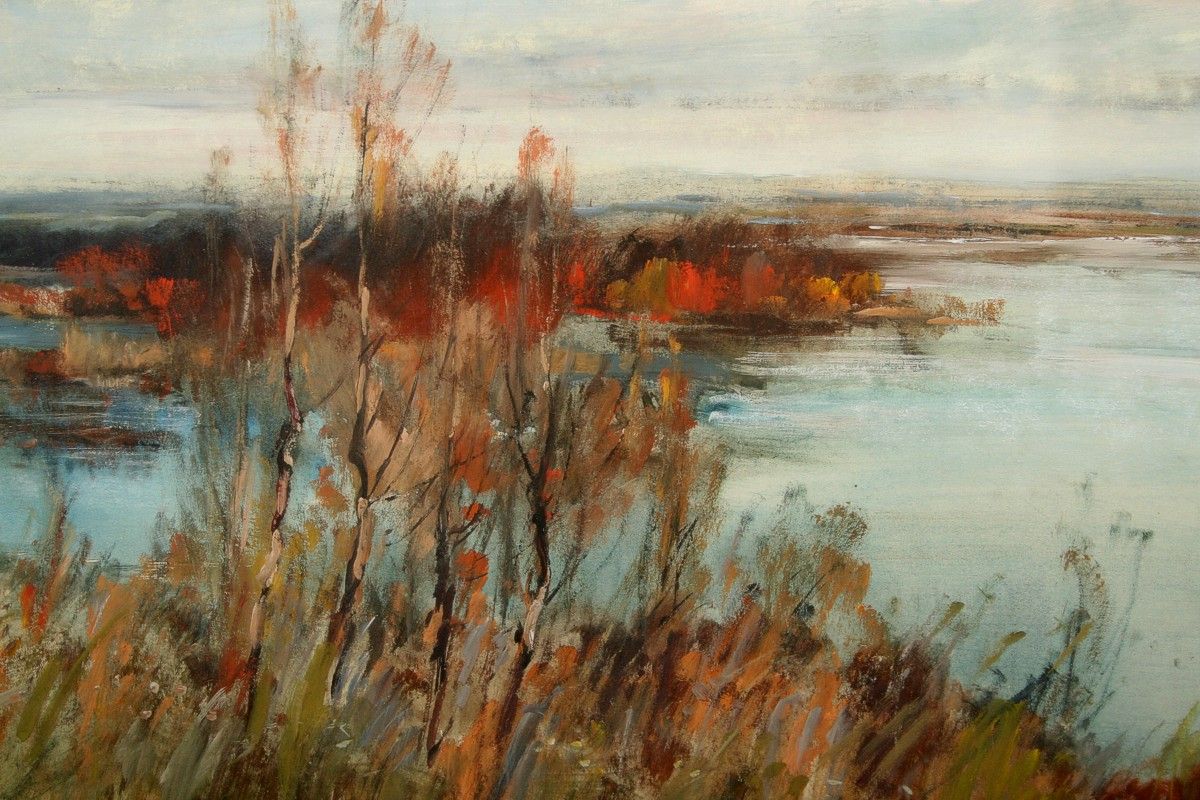 obraz krajiny a nádrže Rozkoš, olej na lepence ve výřezu 30 x 83 cm s rámem 53 x 107 cm, autor Josef Vondráček, nepodepsáno, rámováno pod sklem