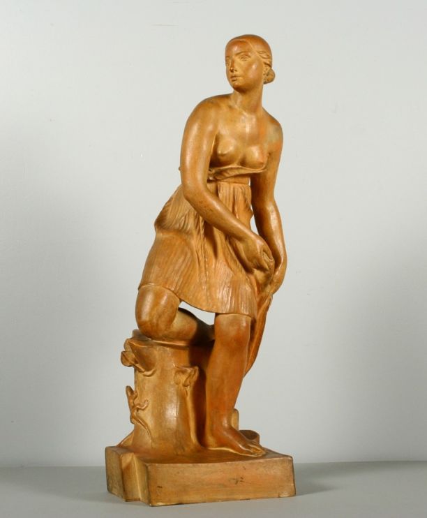 polooděná dívka klečící pravou nohou na kmenu s ještěrkou s dynamickým pohybem těla, pálená hlína, 50 x 18 x 13 cm, podepsáno na soklu plastiky