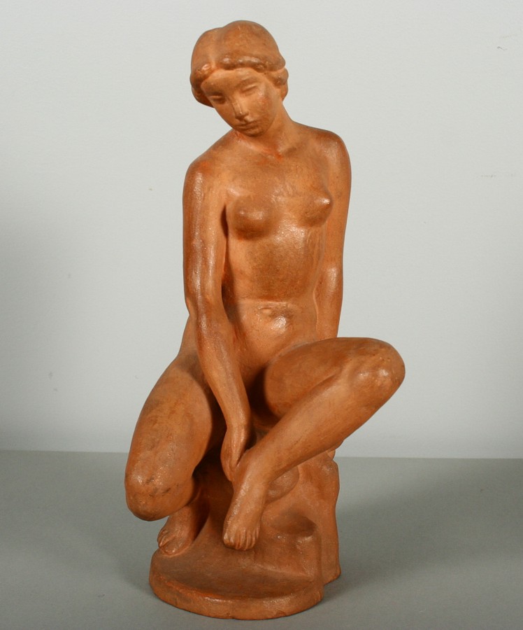 akt sedící dívky, pálená hlína, 24 x 11 x 12 cm, podepsáno na soklu plastiky Břetislav Benda