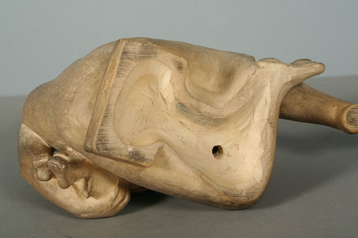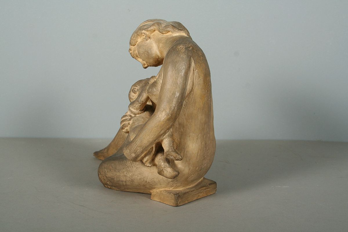 socha kojící matky s dítkem, patinovaná sádra, 21 x 25 cm, autor Břetislav Benda, podepsáno na soklu vrypem B. Benda a tužkou na dně