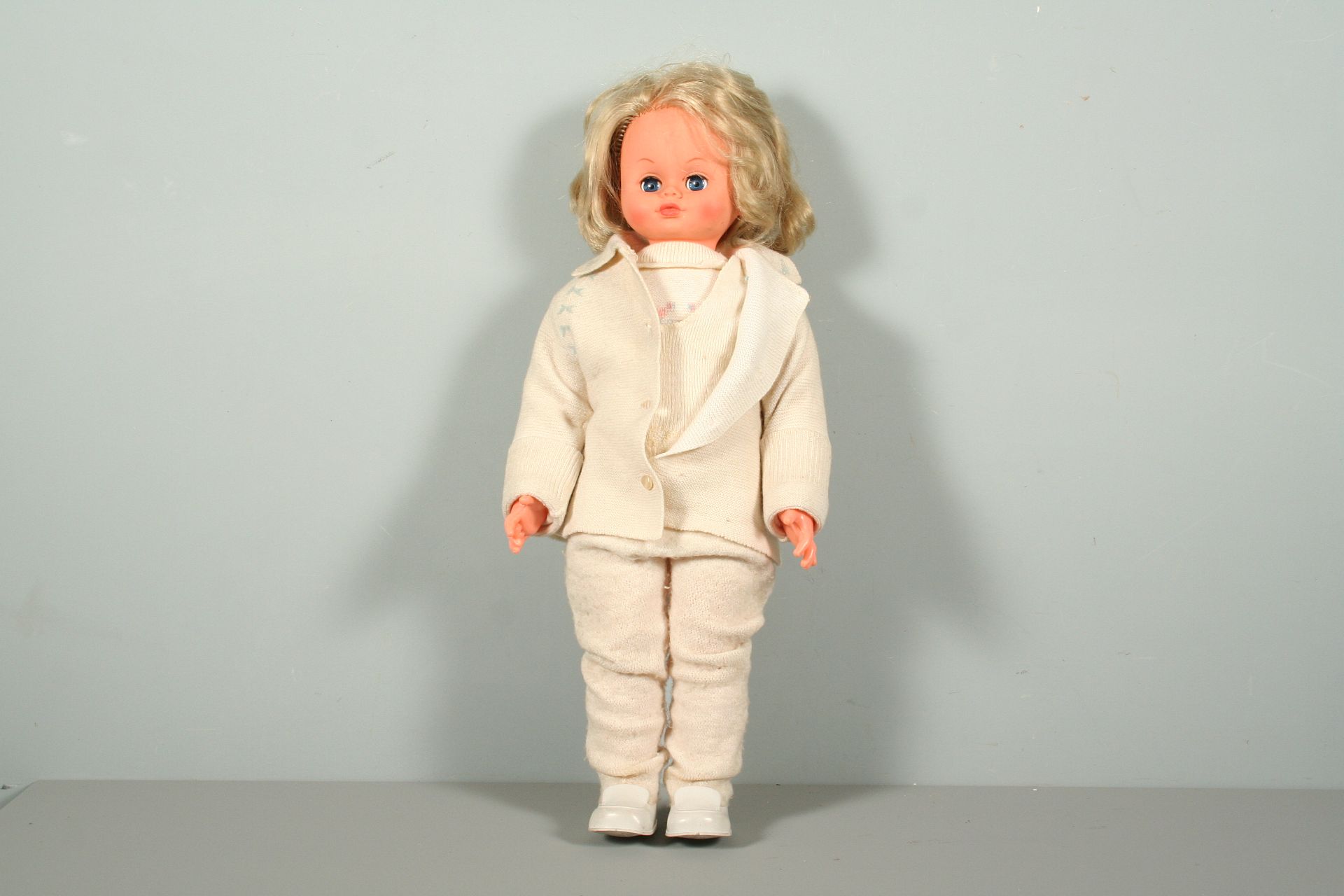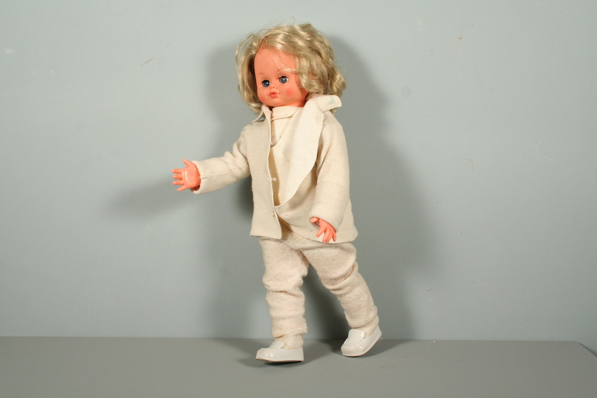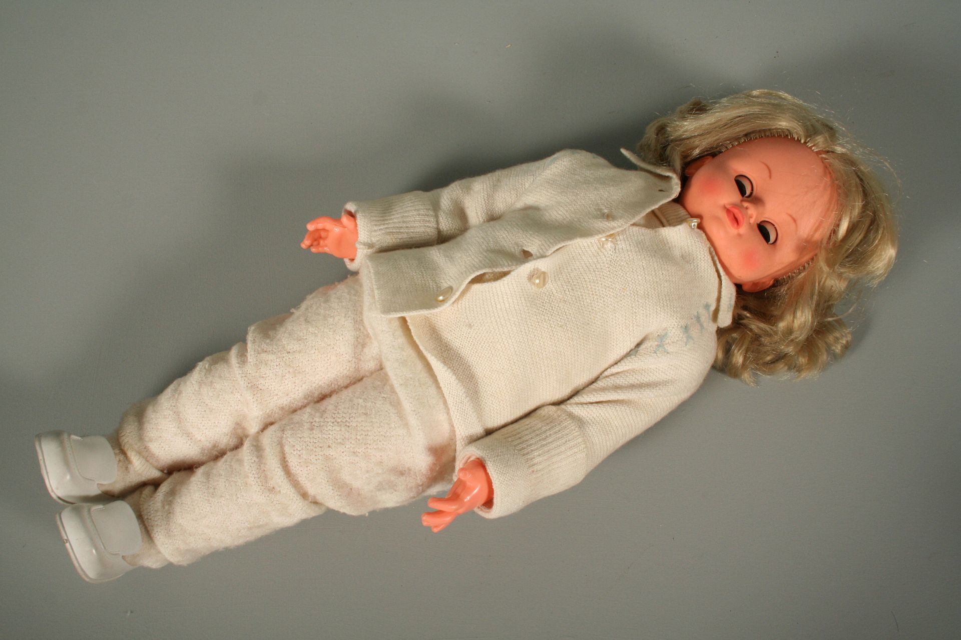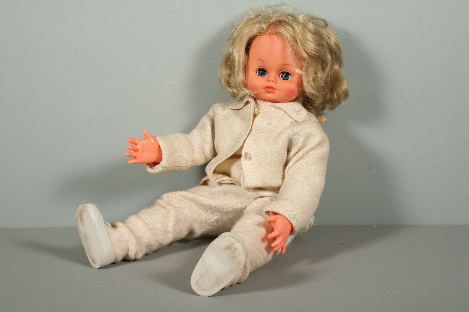 blonďatá panenka, brečící, mrkací, chodící, pletený obleček, vzadu na těle šroubovací víčko, patrně Hamiro, 60 cm, čistá v pěkném stavu
