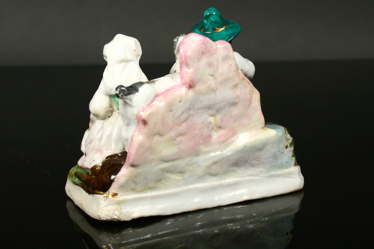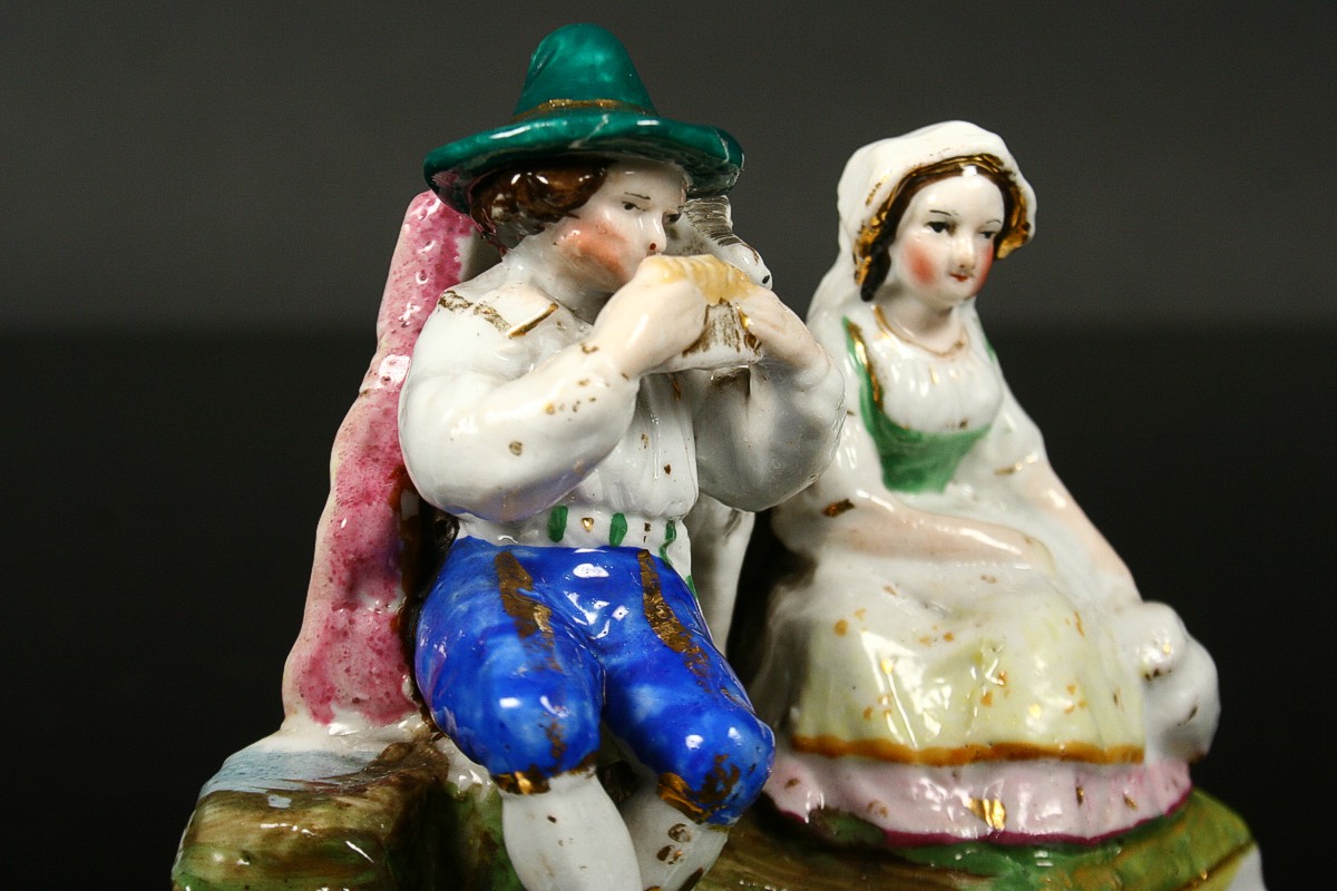 sousoší sedící pár pasoucí kozu, malovaný zlacený porcelán, neznačeno, 19. století, 9 x 10,5 x 6 cm