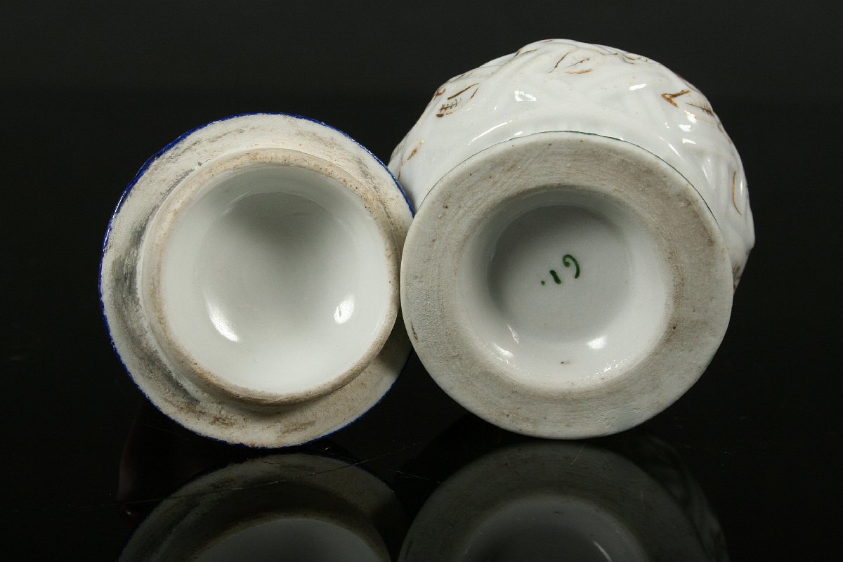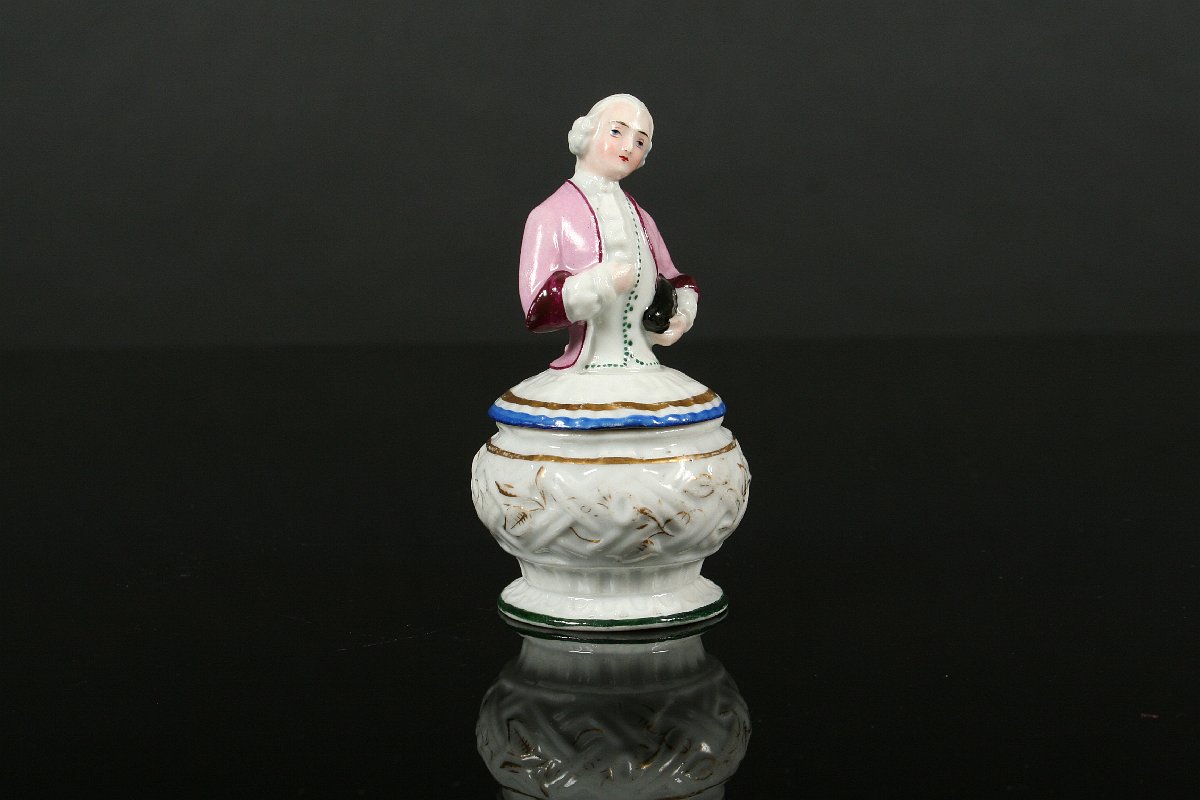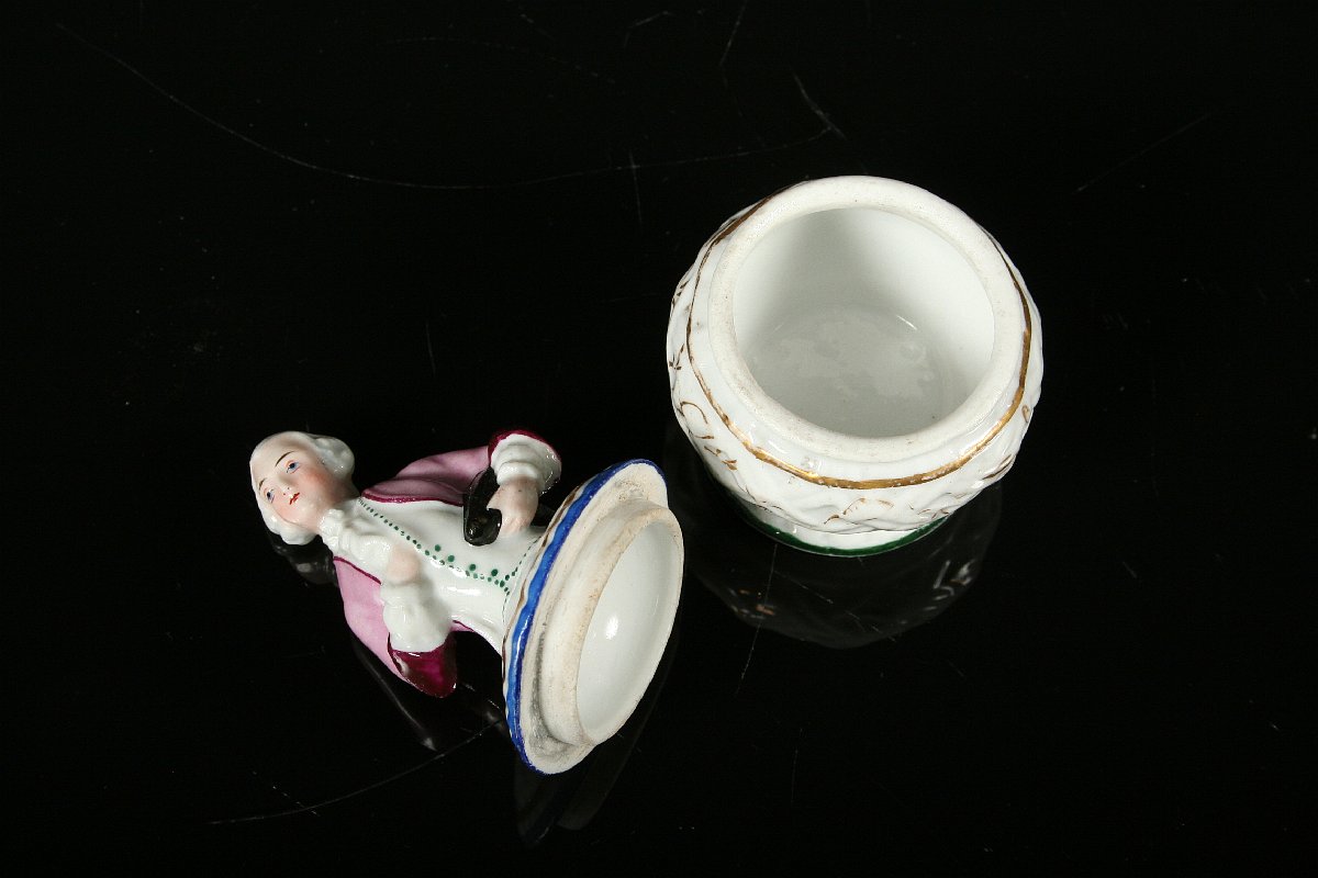 figurální dóza s víčkem, figura kavalíra držícího v ruce klobouk, bílý porcelán malovaný a zlacený, 19. století, značka nenalezena, 10 x 5,5 cm