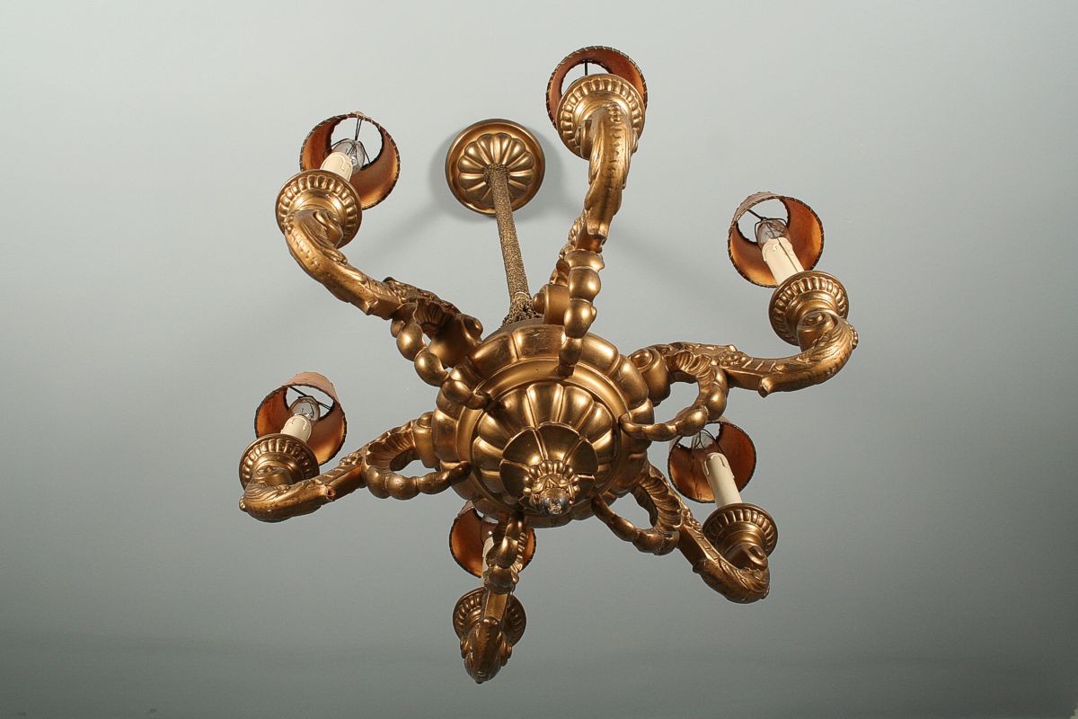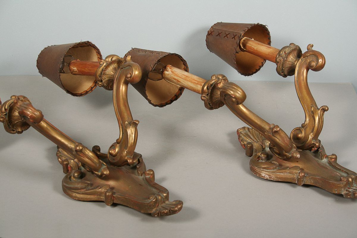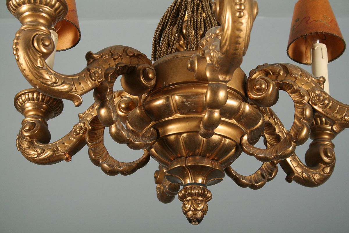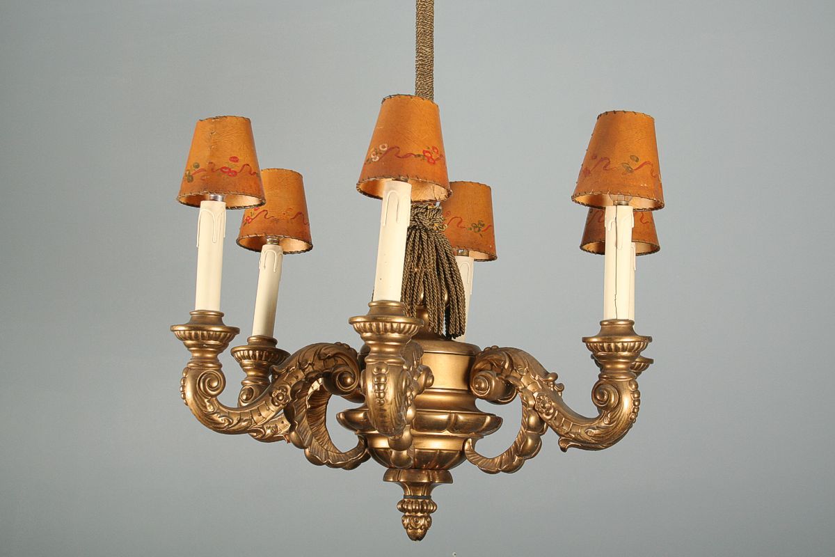 dřevěný bohatě vyřezávaný šestiramenný lustr se dvěma nástěnými dvou ramennými konzolemi v pseudobarokním stylu z konce 19. století, vše zcela v původním stavu s pergamenovými stínidly, 107 x 70 cm