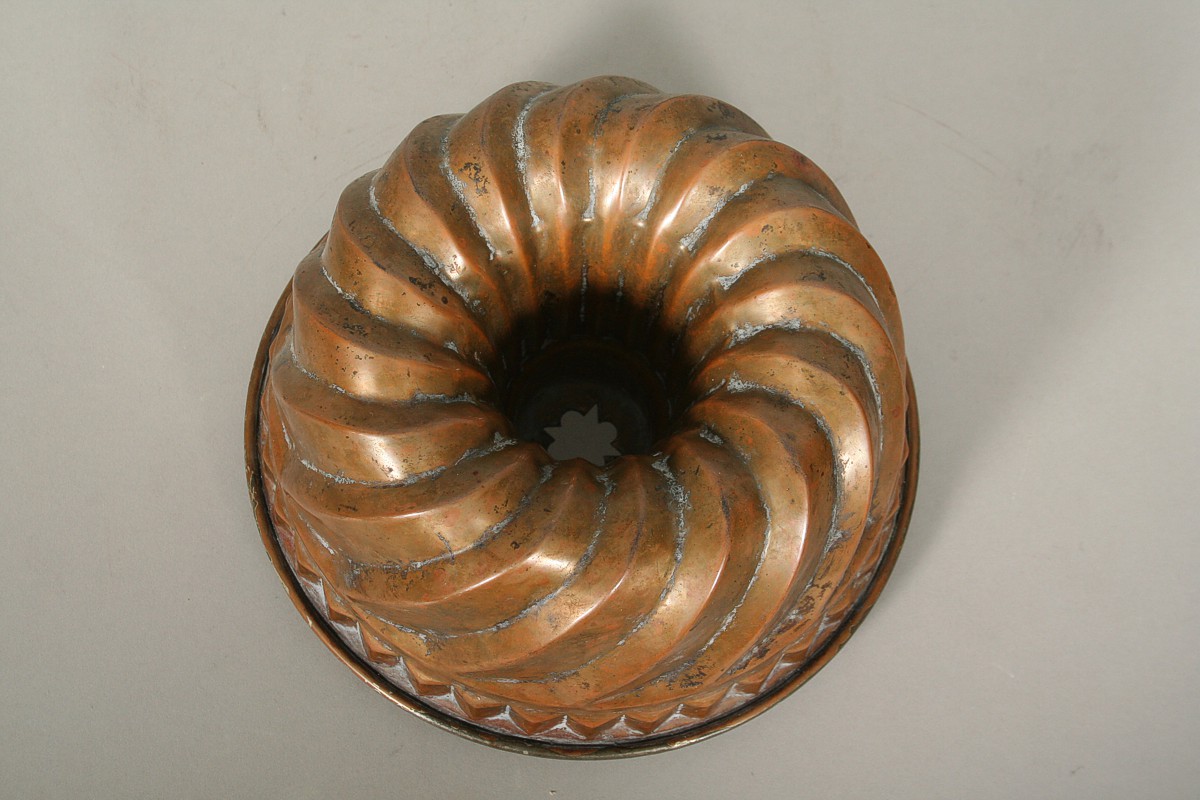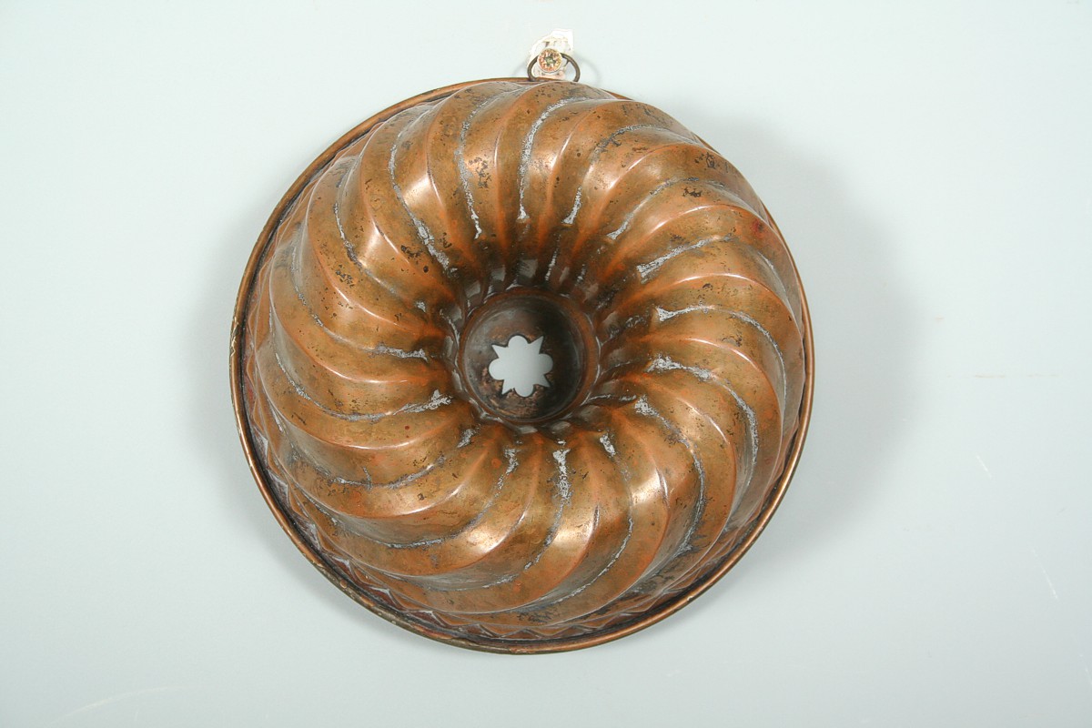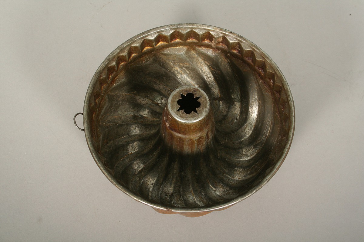 bohatě tvarovaná, měděná forma na bábovku z 19. století, uvnitř vycínovaná, 12 x 23 x 23 cm, ouško k zavěšení